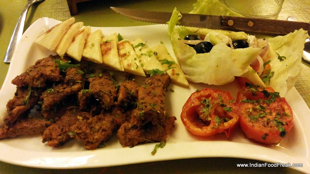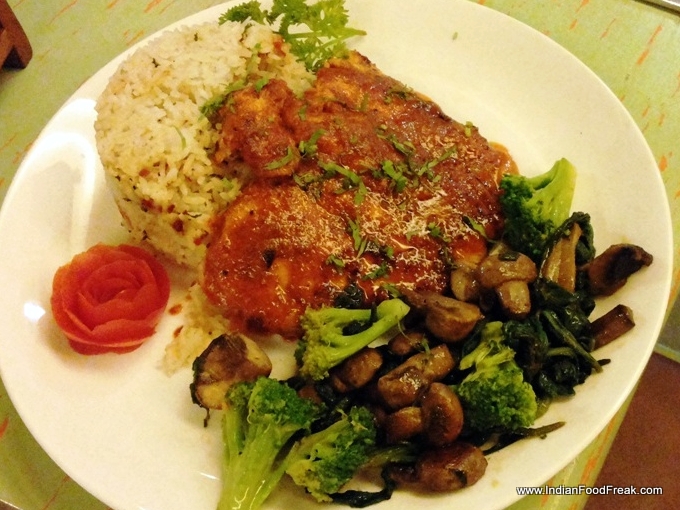 The Lamb Steak, topped with Rosemary sauce, came with stir fried vegetables & mashed potatoes. This was delightfully well cooked, the meat soft but retaining the bite and the sauce had strong flavors, both making a wonderful medley. The mash was creamy and went well with the dish. The Cajun Prawns, with garlic spinach sauce and salad, weren’t the best I’ve tasted. The glint of the oil they were deep-fried in still remained, both on the face and in the taste. The Mexican Pepper Chicken contained crisp morsels of chicken, rubbed with Mexican spices (as the menu said), with salad and salsa. The chicken was cooked well, the flavors well balanced and had a nice tangy-spicy edge to it. The Portuguese Chicken consisted of chicken breast topped with hot peri peri sauce, accompanied with herb rice and sautéed vegetables. The chicken again was nicely cooked, had the tenderness and the juices intact, and together with the sauce was an exquisite combination. The rice was subtly flavored and the whole dish was a delight! I would love to go back for this! The fish in the Lemon Chili Fish was extremely soft, tender and beautifully flavored with the lemon and a hint of chili. I loved the accompanying baby potato salad too! The pasta was not great, but as good as anywhere else. The Persian Lamb came with a thick pita bread lookalike, cut into triangles. Where the lamb was beautifully tender and succulent, the bread was hard to chew. I had taken away a Lamb Burger to my room for midnight snacking- a soft bun inside which were a thick lamb patty, fried egg, lettuce, tomato, caramelized onions, mayonnaise and cheese, with fried and salad on the side. The burger, which had turned cold by the time I had it, still tasted good, with all the elements coming together beautifully.