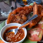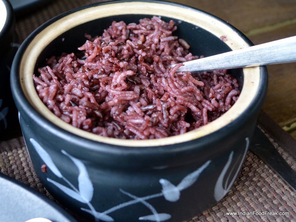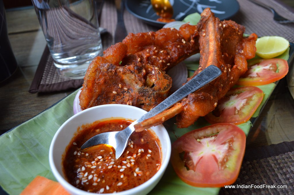 The Rosang Special Pork Fried Spare Rib was a calorie bomb, huge, deep-fried, marinated ribs flaunting pared meat and fat to spare. An otherwise excellent appetiser was rendered unflattering due to soggy cubes of fat, perhaps the result of frying in not-as-yet-ready hot oil. But the Pork Dimsum more than made up for its oily compatriot, the juicy, mildly spiced, pork balls blending beautifully with the freshly made dimsum roll. The house special Chilli chutney was wonderfully hot, spiked by the sharp, needle like heat of the Booth Jalokia. The phantasmagoricalchilli was omnipresent in all of Rosang’s chutneys and dishes. The Masoden- Burnt Brinjal Chutney with fish sauce and Iromba- Vegetable chutney, with fish sauce were loaded with a spicy, tangy taste that went very well with the wild red rice.