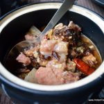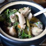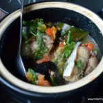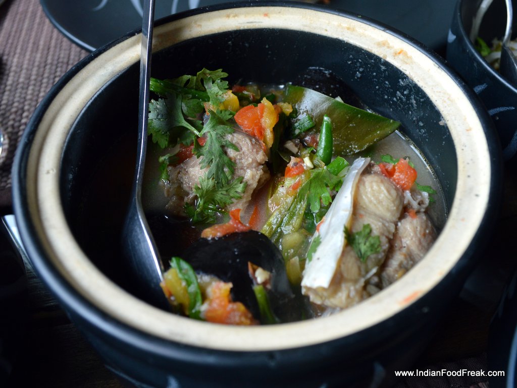 Ngtok- Herb Fish Stew without oil sweeps you away with its rich flavour and aroma but light texture. Spiced with special herbs and lemon grass, it tasted great with the Wild Red Rice that came in a bowl. The red rice was similar to basmati rice in grain size but with a nutty, and surprisingly un-tough, non-chewy texture. It paired very well with the stew and the other two dishes that followed. Christened unimaginatively as Boiled Chicken with yam leaf and lemon leaf, the superlative dish was light and tasty while the Pork with dry yam leaf and mustard leaf was satisfying