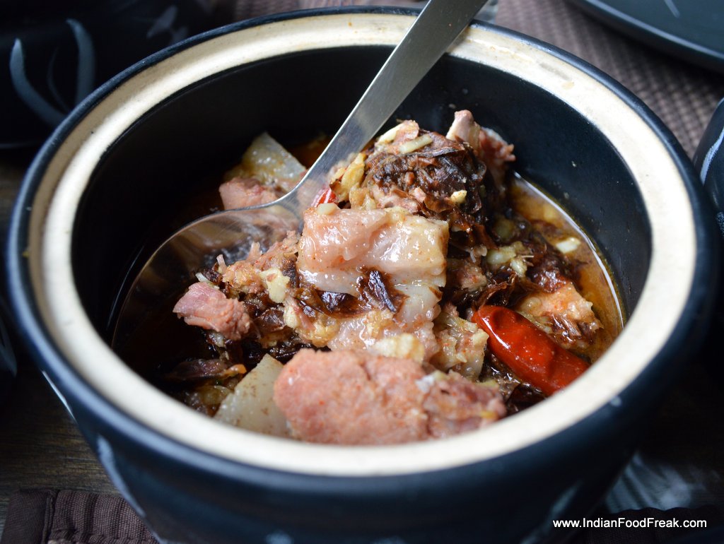 Ngtok- Herb Fish Stew without oil sweeps you away with its rich flavour and aroma but light texture. Spiced with special herbs and lemon grass, it tasted great with the Wild Red Rice that came in a bowl. The red rice was similar to basmati rice in grain size but with a nutty, and surprisingly un-tough, non-chewy texture. It paired very well with the stew and the other two dishes that followed. Christened unimaginatively as Boiled Chicken with yam leaf and lemon leaf, the superlative dish was light and tasty while the Pork with dry yam leaf and mustard leaf was satisfying
