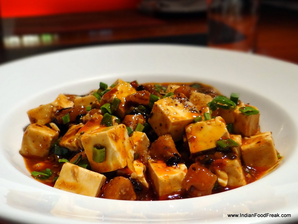 I request Chef Ding Jiming to make me a dish that I had tasted over a decade ago at the Chicago Chinatown, and have not been able to get it out of my mind ever since. The dish is a popular dish from China’s Sichuan province and is called mapo tofu. I have ordered it countless times in India, but never gotten the same experience. It is a combination of tofu set in a spicy chili- and-bean-based sauce, typically a thin, oily, and bright red suspension, and often cooked with fermented black beans and minced beef or pork. True mapo tofu is powerfully spicy with both conventional “heat” spiciness and the characteristic “mala” (numbing spiciness) flavor of Sichuan cuisine. As per Wikipedia, the feel of mapo tofu is often described by cooks using seven specific Chinese adjectives: numbing, spicy hot, hot temperature, fresh, tender and soft, aromatic, and flaky. These seven characteristics are considered to be the most defining of authentic mapo tofu.