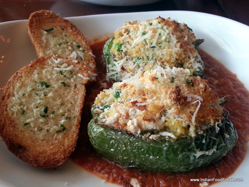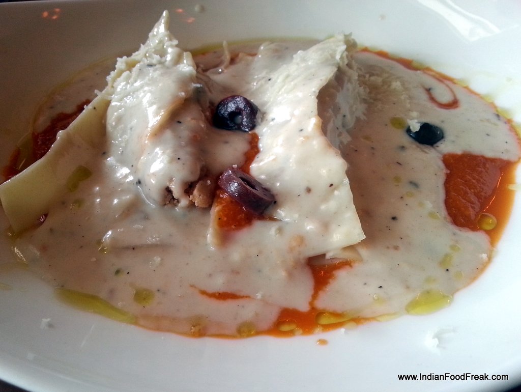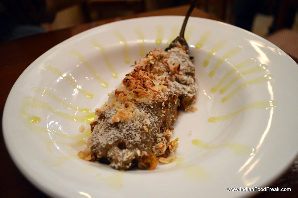 DSC_0042With the pintxos satisfactorily polished off we set our sights on the main course. The restaurant bowing to popular predilections offers some pasta and sandwiches too. The Chicken in the Canelloni was a little firm like that of a seekh kebab. A dollop of béchamel added to the mince would have rendered it faultless. Both the Baked Capsicum stuffed with Couscous on a bed of tomato-based sauce and the Eggplant Caviar were topped with panko crumbs and very little cheese. A melting mozzarella or a browned Emmenthal would have provided a clever counterpoint and raised the dishes to a superior level.