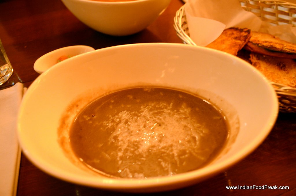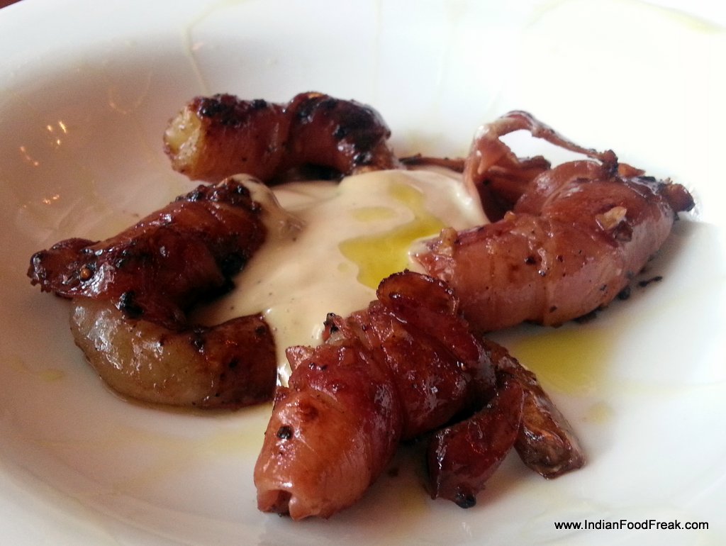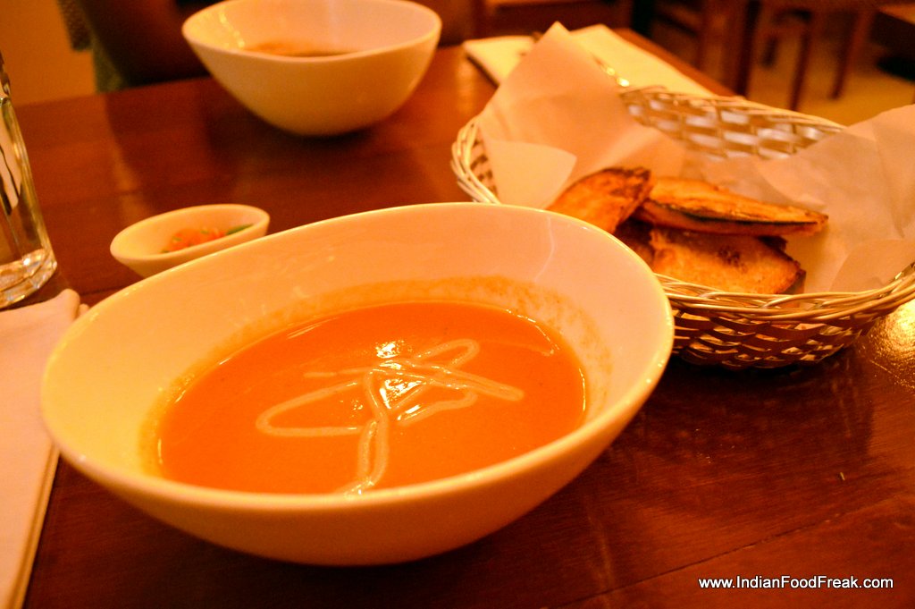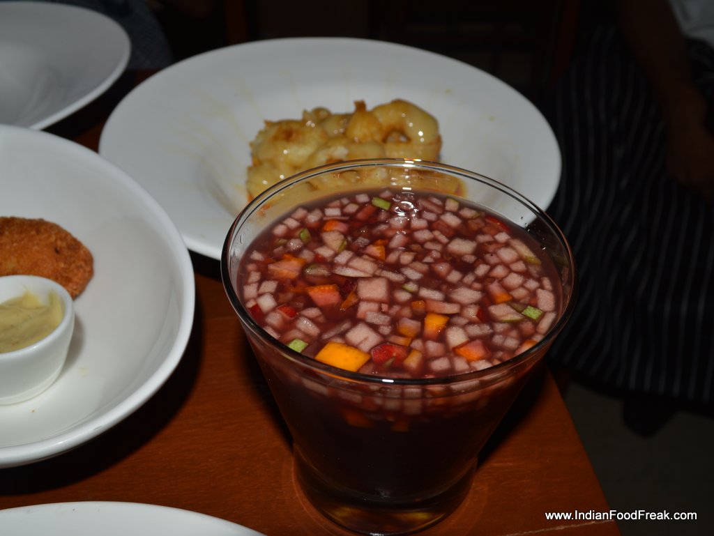 Fried CalamariThe Fried Calamaries served on a bed of Romeso and Alioli sauce were appetizing, while the FriedPrawns wrapped in Serrano ham were a bit too oily. A better take would have been to have the prawns grilled, wrapped in bacon, which is softer and wraps around the crustacean easily than the stiff and cured Serrano ham. The Gazpacho soup is another must try, the chilled Andalusian soup of fresh tomatoes, cucumber and bell peppers spiked with garlic and onion, refreshingly tasty but for an excess of vinegar. A little less of the acidic condiment, and the soup would score 5 stars. On the other hand, the reassuring, pureed Hot Lentil soup teases your taste buds with a dash of strong goat cheese.