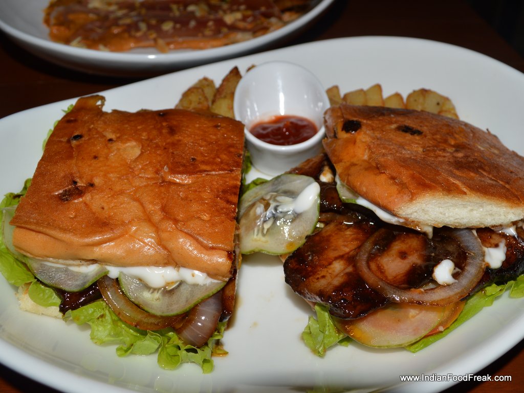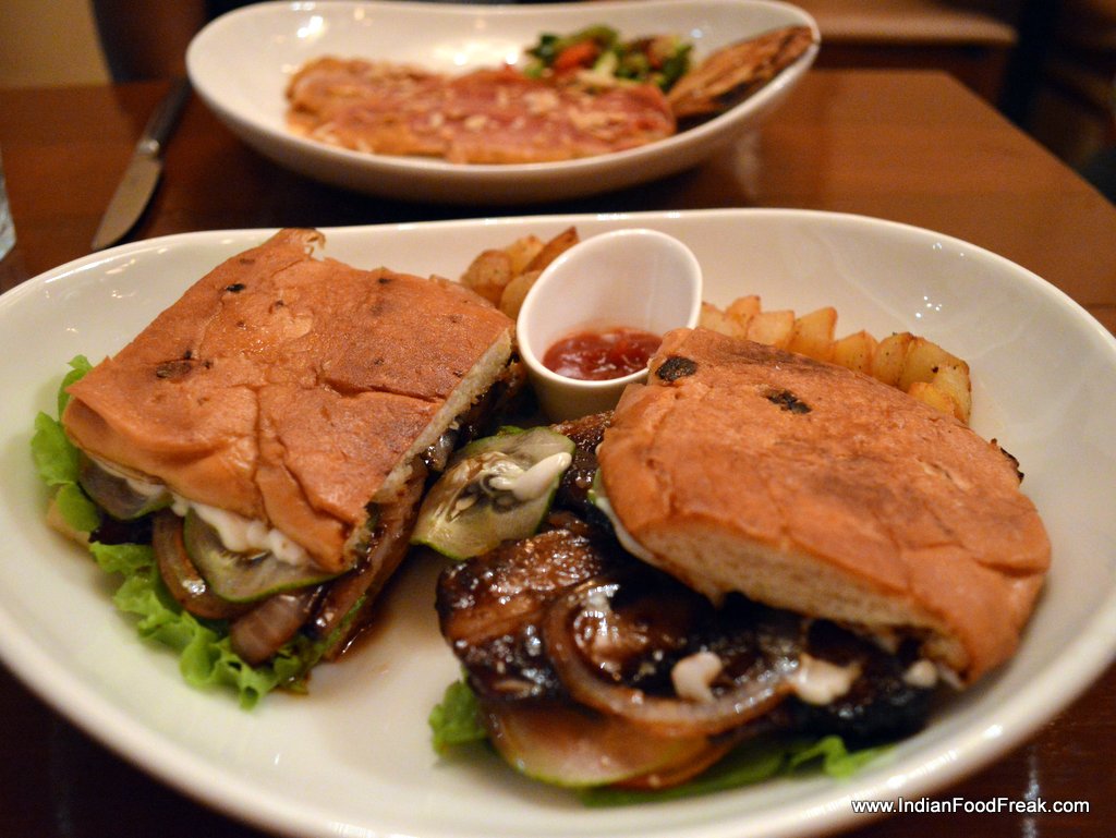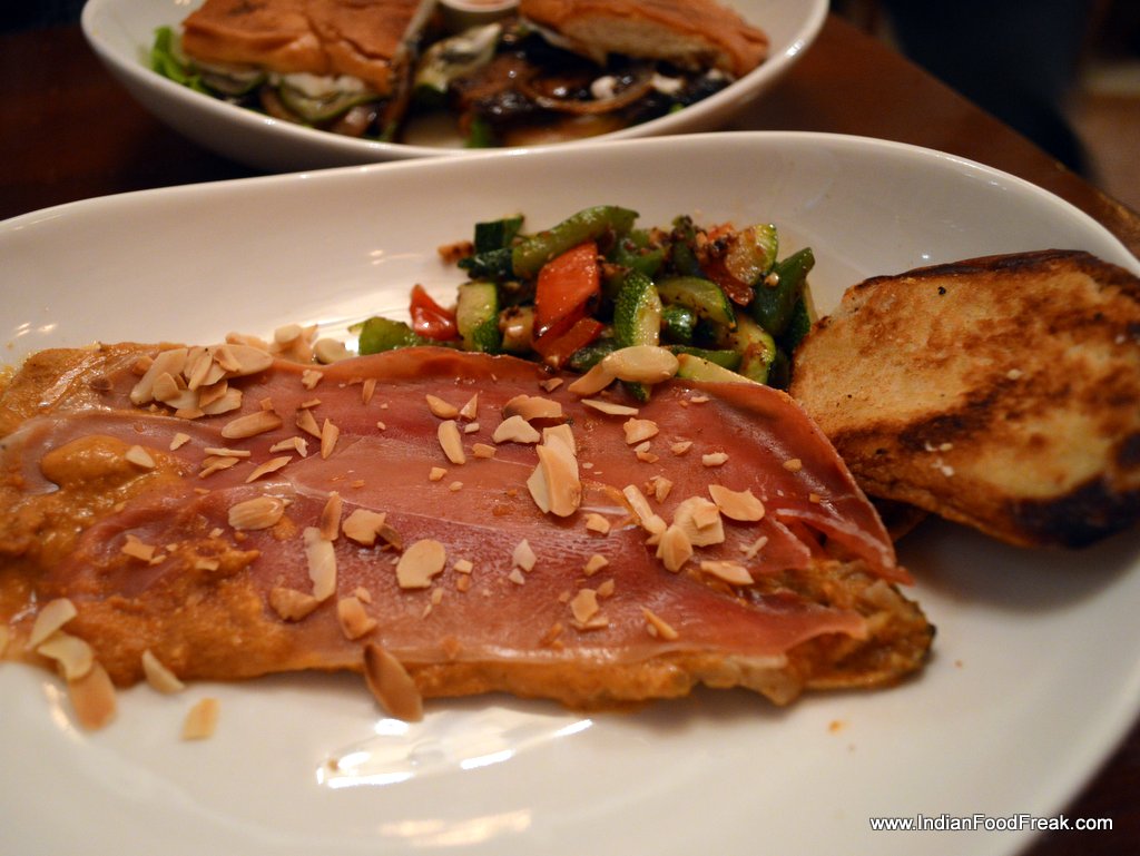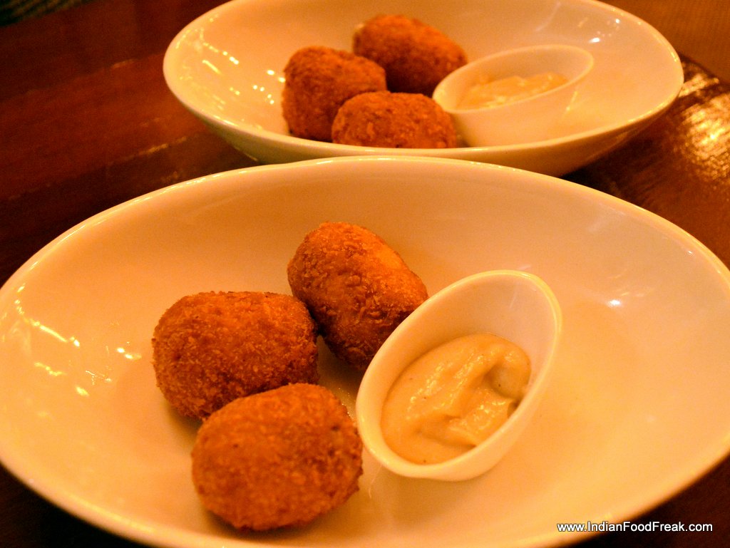 DSC_0029Chef Sushmit Daniels readily comes to the table to explain the menu, which is available, both as a card and is also written on the glass paned window on the outside. The half curtain, the dim lighting, the Gypsy Kings on the iPod, the Joan Miro print on the wall all try to recreate a Hispanic ambience. Without hesitation, I ordered their Ham and Cheese Croquetas and the vegetarian Mushroom variant on both visits. While the first visit had me disappointed what with a perfectly done, lovely looking, and delicious tasting croquetas, served reheated after we pointed out that the inside of the croquets were still cold. But the second visit made ample amends. The Spanish Ham and Mozzarella- Manchego cheese combo was delicious while the mushroom one boasting of the mundane button mushroom, the hearty, nutty porcini and the woodsy, spongy shitake was sheer bliss. The restaurant thoughtfully serves eggless Aioli. Don’t forget to try the croquetas on your visit.