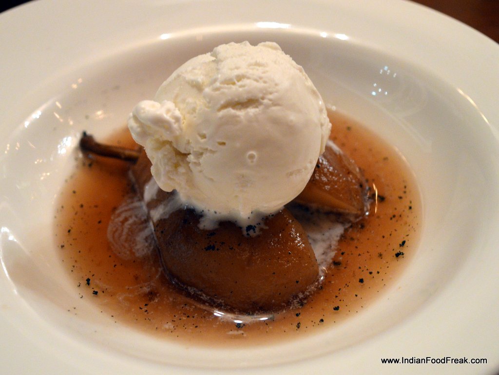 DSC_0044The well known and much loved Flan or Caramel custard was too sweet perhaps because of the caramel being dished over the already sweet custard instead of under it. But the must try dessert here is the Poached Pear with Vanilla ice cream. Sheer joy floats on syrup made of brown sugar, fresh vanilla pods and cinnamon.