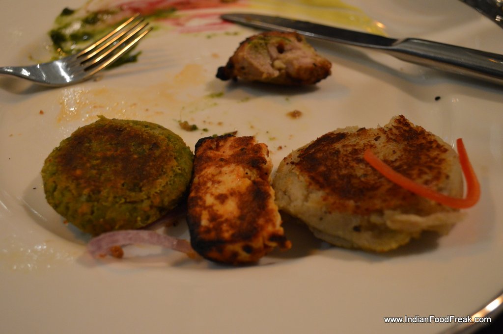 On the vegetarian side, the dhungara smoked paneer tikka (Rs 500) with slow cooked paneer, tomatoes, mawa, and melon seeds is simply perfect. What stands out here is its smoky taste and the wonderful quality of the paneer, which the hotel makes itself. The chowk ki tikki (Rs 500), pan seared green peas and potato patty is enjoyable in a street-food chatwallah way. The subz shammi (Rs 500) having minced vegetable patties, cardamom, and mace somehow pales in comparison to the other options.