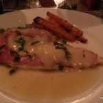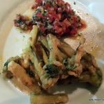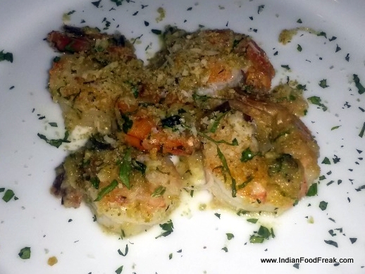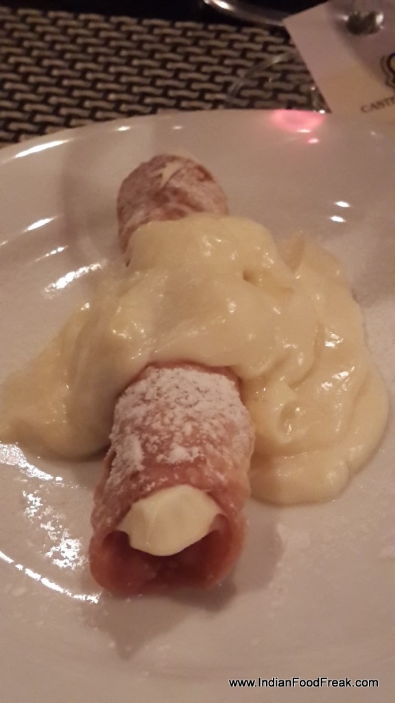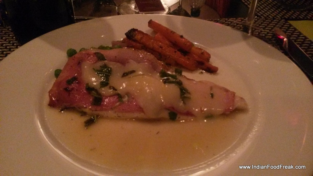 For the second course I chose garlic prawns baked with savory and cheesy crumbs. Even though the prawns were fairly good in taste, one prawn was undercooked which took the joy out of the rest of the platter. This we paired with a BiancoToscano. The white Tuscan Castelgrave was quite easy on the palate and fruity on the nose. For the main course I chose a chicken breast topped with honey roasted ham, provolone, sage and moscato wine sauce. This I paired with a Chianti from Tuscany which had strong fruity notes and was very easy in the mouth. The dish in itself was quite happy but the deli meats lend it an interesting edge. The sweetness from the moscato sauce was an apt accompaniment to the salty cheesiness of the provolone, though I did feel that it was a bit heavy on the stomach. But guilt trips do not ever make an appearance in a diehard foodie’s life. My partner ordered a vegetarian Penne pasta with mixed vegetables which was as boring as it sounds and had no punch in the flavouring either.