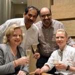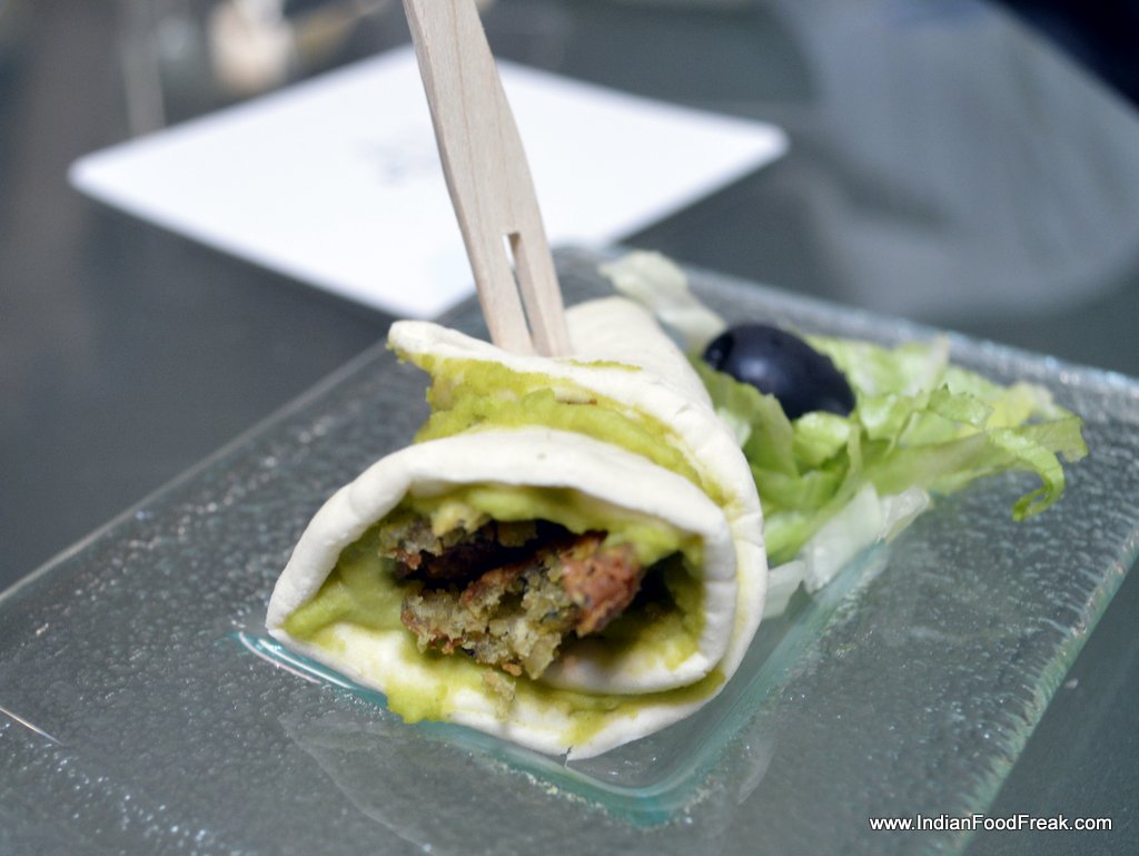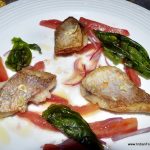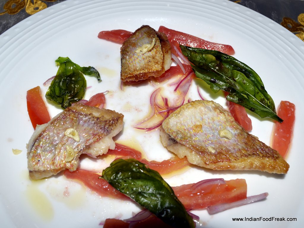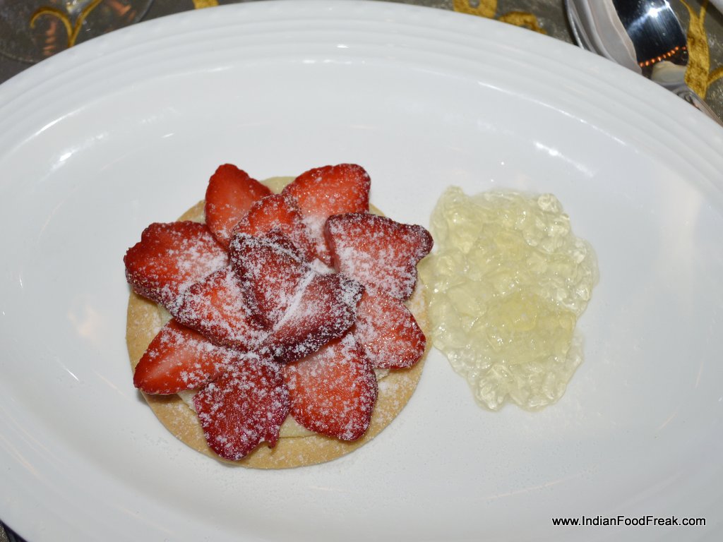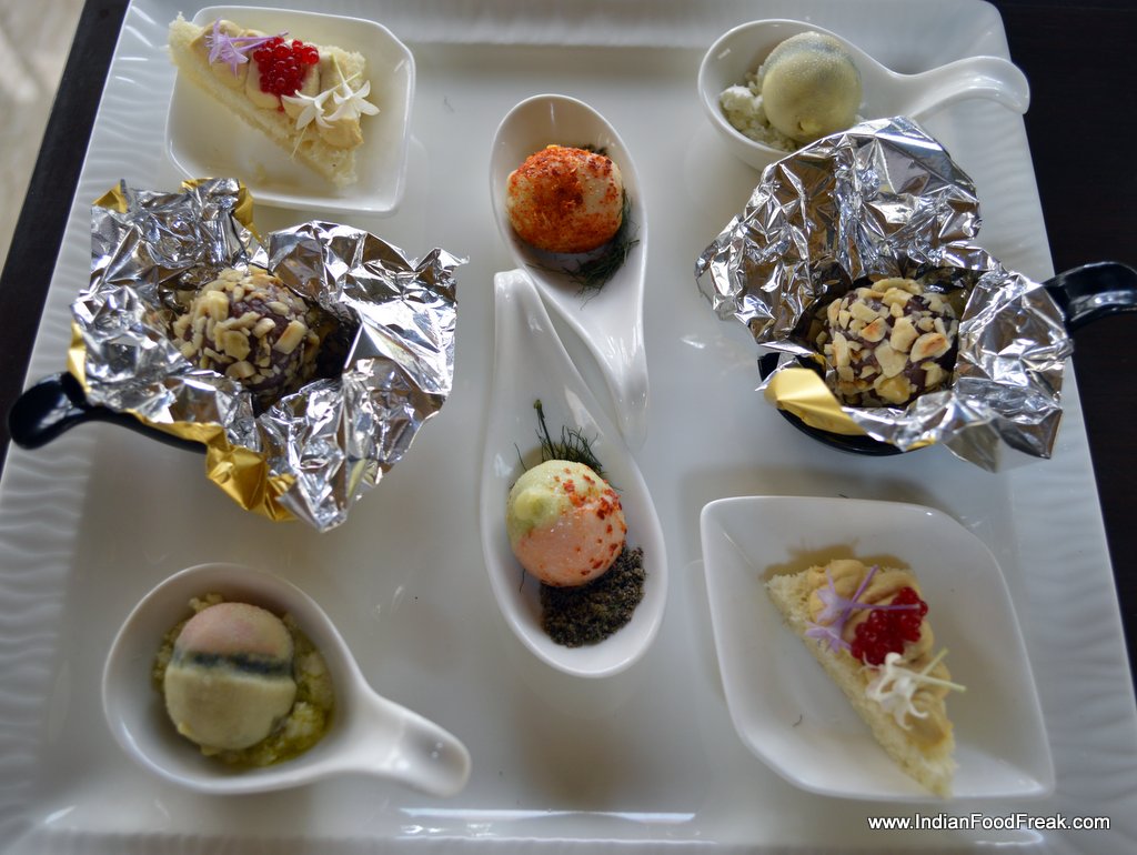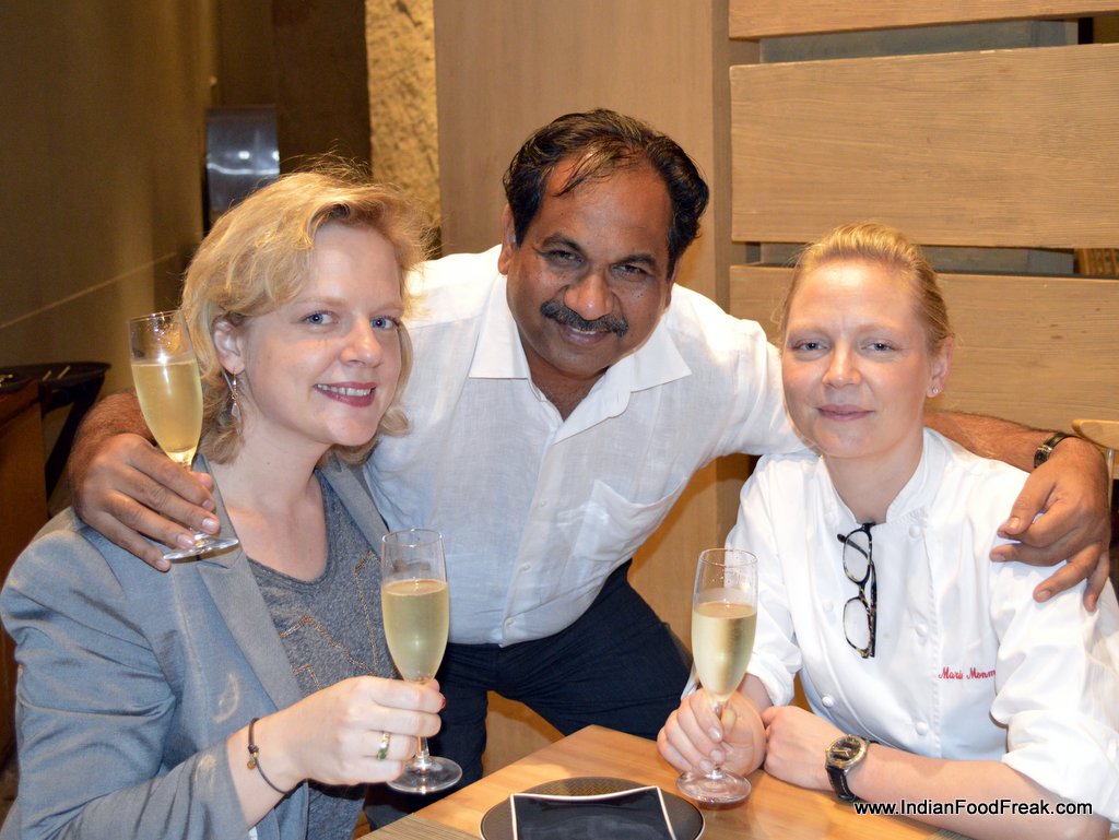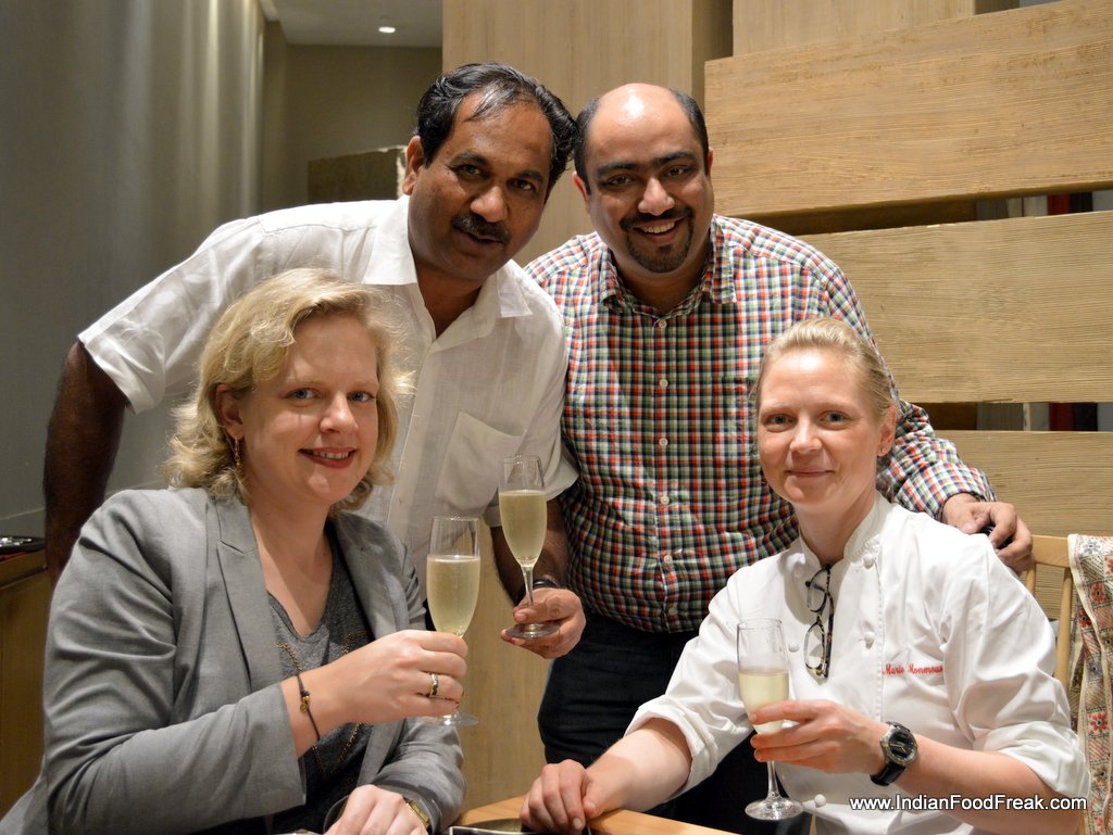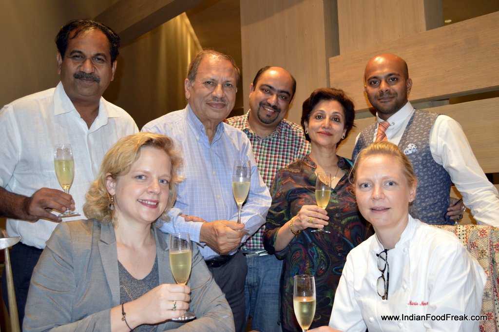 My friends for the evenings included Reva Singh, Magandeep Singh, Subhash Arora, Juliette and Abhay Kewadkar to give his personal touches. Marie was busy in the kitchen to prepare the dinner but joined us briefly. All the guests were pleasantly surprised to note that the platter served along that looked like desserts was Italian Masterchef Greco’s special preparation for all of us. It included Foie gras rochers, Brioche & Foie Gras granche topped with strawberry caviar, reconstructed guacamole in red chilli and olive powder, and eggplant parmigiana. It was sufficient to raise our appetite and went well with the sparkling.