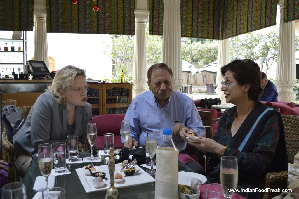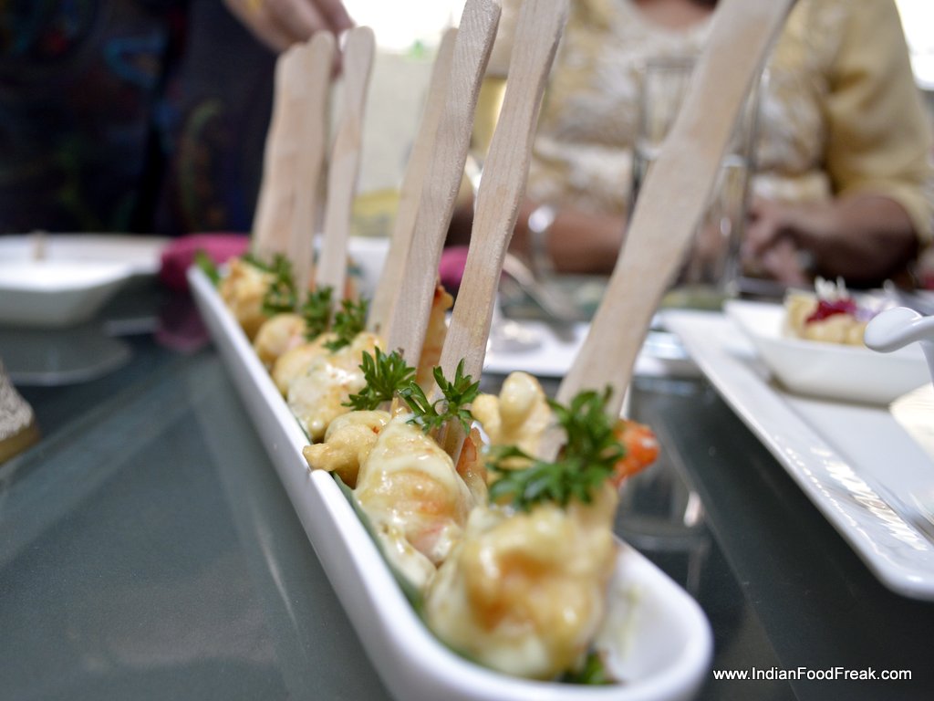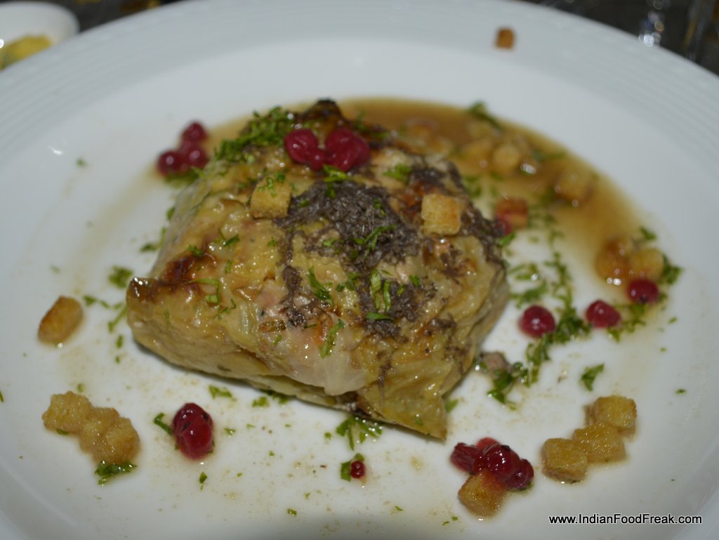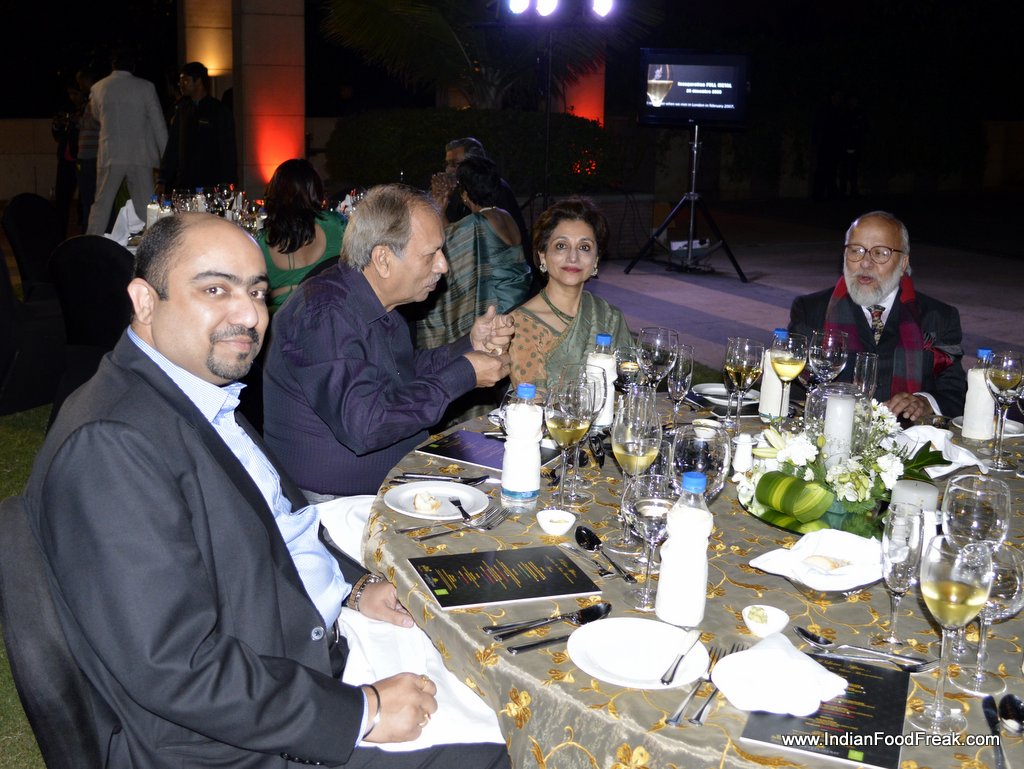 My friends for the evenings included Reva Singh, Magandeep Singh, Subhash Arora, Juliette and Abhay Kewadkar to give his personal touches. Marie was busy in the kitchen to prepare the dinner but joined us briefly. All the guests were pleasantly surprised to note that the platter served along that looked like desserts was Italian Masterchef Greco’s special preparation for all of us. It included Foie gras rochers, Brioche & Foie Gras granche topped with strawberry caviar, reconstructed guacamole in red chilli and olive powder, and eggplant parmigiana. It was sufficient to raise our appetite and went well with the sparkling.