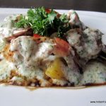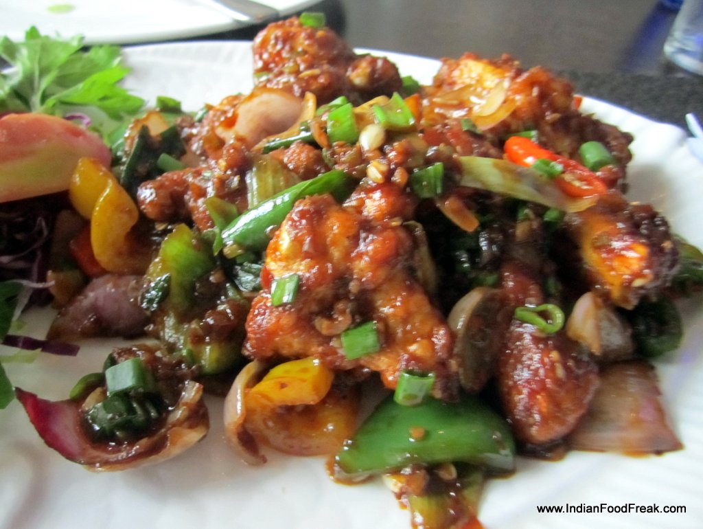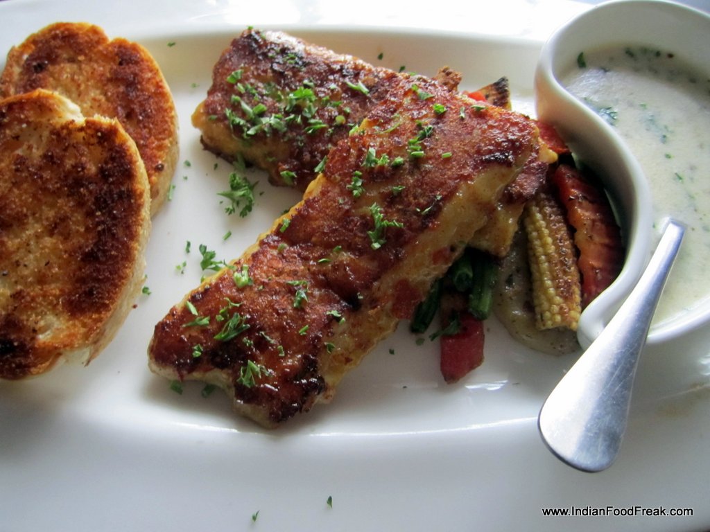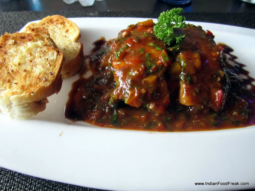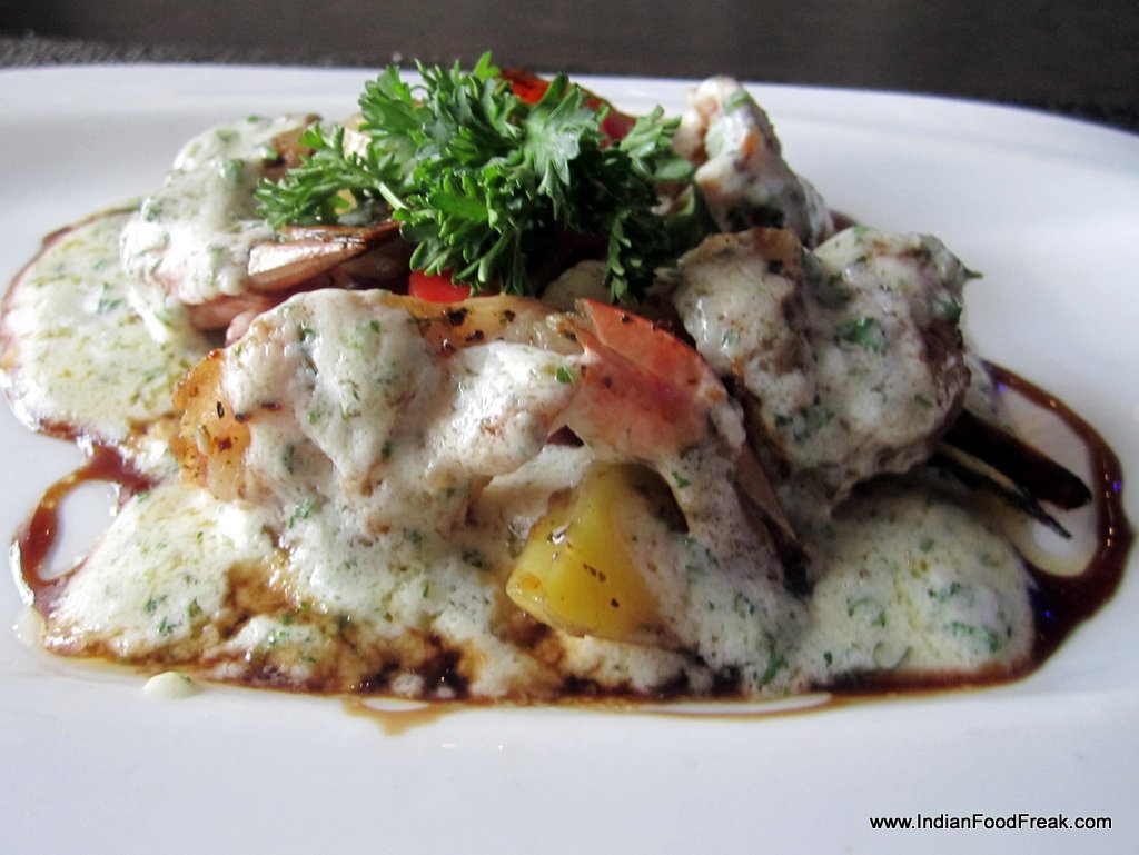 Grilled fishThe seafood basket (Rs 525) has a basket made out of papads and has fried fish, prawn and squid in an indeterminate batter. I am told this is a popular beer snack. For me it is a bit too bland, and a bit overcooked. The next dish, grilled fish with butter garlic sauce (Rs 410), contrasts with the previous one. It is beautifully cooked and tastes amazing. The sauce pairs well with the freshest of fresh fish.