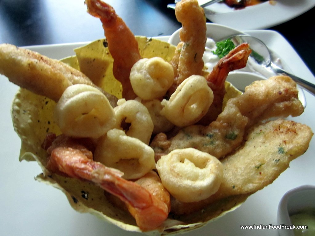 Seafood basketI can live day in and day out on seafood alone. One sacrifice I have had to make living in Delhi has been to deprive myself of fresh fish and seafood. A visit to the Blue water grill at Rajouri Garden takes care of that. Because here lies a treasure trove of fish that still tastes of the ocean, and some wonderful dishes.