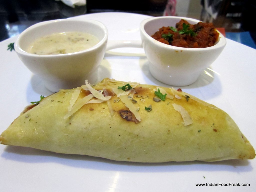 And there is a lot of interesting dishes to taste here. The hot Banarasi kachoris filled with spicy daal masala and served with aloo sabzi and petha sabzi, apple cardamom dip, coriander green chilly chutney, tamarind chutney, groundnut chutney (Rs.125) is one such delicious dish which is a meal by itself. Kashmiri spicy lotus root mixed with boiled and mashed potatoes, lightly fried and served with lotus stem chips, moojh (radish and yogurt dip), coriander chilly chutney and tamarind chutney (Rs125) has many textures combining to make a perfect bite. Mushroom Tapas with sautéed mushroom Spanish style and served with a chunky tomato and oregano sauce (Rs 165) is a simple yet addictive dish. The onion tomato chillies crepes served with mushroom cheese dip (Rs195) are saucy and exciting in character, but can do with a softer crepe. Hot off the oven calzone filled with veggies (Rs.195) is filling.