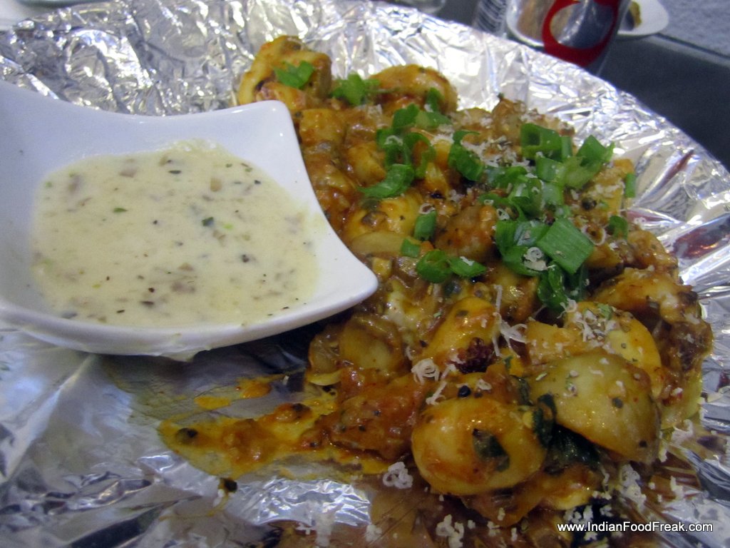 And there is a lot of interesting dishes to taste here. The hot Banarasi kachoris filled with spicy daal masala and served with aloo sabzi and petha sabzi, apple cardamom dip, coriander green chilly chutney, tamarind chutney, groundnut chutney (Rs.125) is one such delicious dish which is a meal by itself. Kashmiri spicy lotus root mixed with boiled and mashed potatoes, lightly fried and served with lotus stem chips, moojh (radish and yogurt dip), coriander chilly chutney and tamarind chutney (Rs125) has many textures combining to make a perfect bite. Mushroom Tapas with sautéed mushroom Spanish style and served with a chunky tomato and oregano sauce (Rs 165) is a simple yet addictive dish. The onion tomato chillies crepes served with mushroom cheese dip (Rs195) are saucy and exciting in character, but can do with a softer crepe. Hot off the oven calzone filled with veggies (Rs.195) is filling.