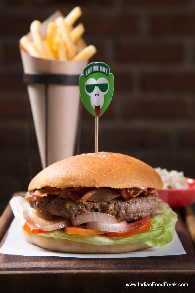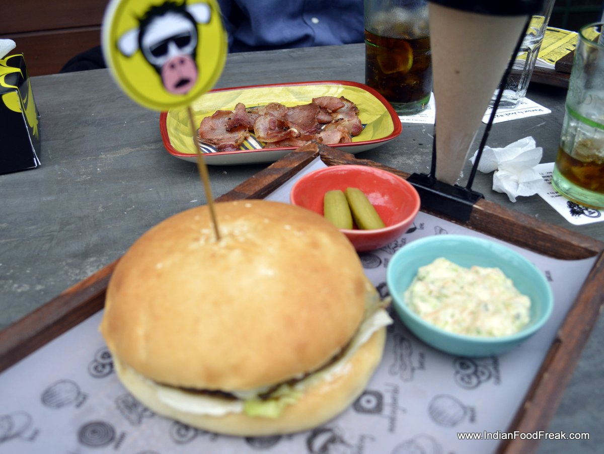 Beef & Cheese BurgerThe best burger at the Monkey Bar, as they claim, is Mobar Burger with 300gms beef patty, cheese, bacon, onion, lettuce etc, but given all that I had already eaten much and still had greed to try something more, I order cheese & beef burger (340) which has a 200gm beef patty. Small mercy that at times I have on myself :). A big slightly toasted bun with beef cooked to medium rare as per my liking and perfectly seasoned would speak very high of this new outlet in Delhi if the mayonnaise  were to be a little less. The juicy burger patty and extra mayonnaise makes it a little soggy before the entire burger is over. A small glitch in an otherwise great meal!