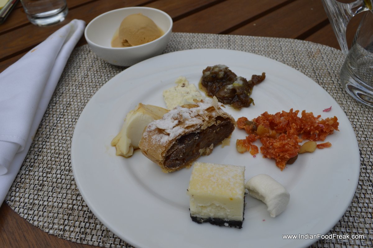 apple strudel, Indian mithai, Italian Tiramisu, homemade gelato, American brulee and much much more. Do not miss on the home made salted caramel icecream and surprisingly addictive gajar ka halwa.