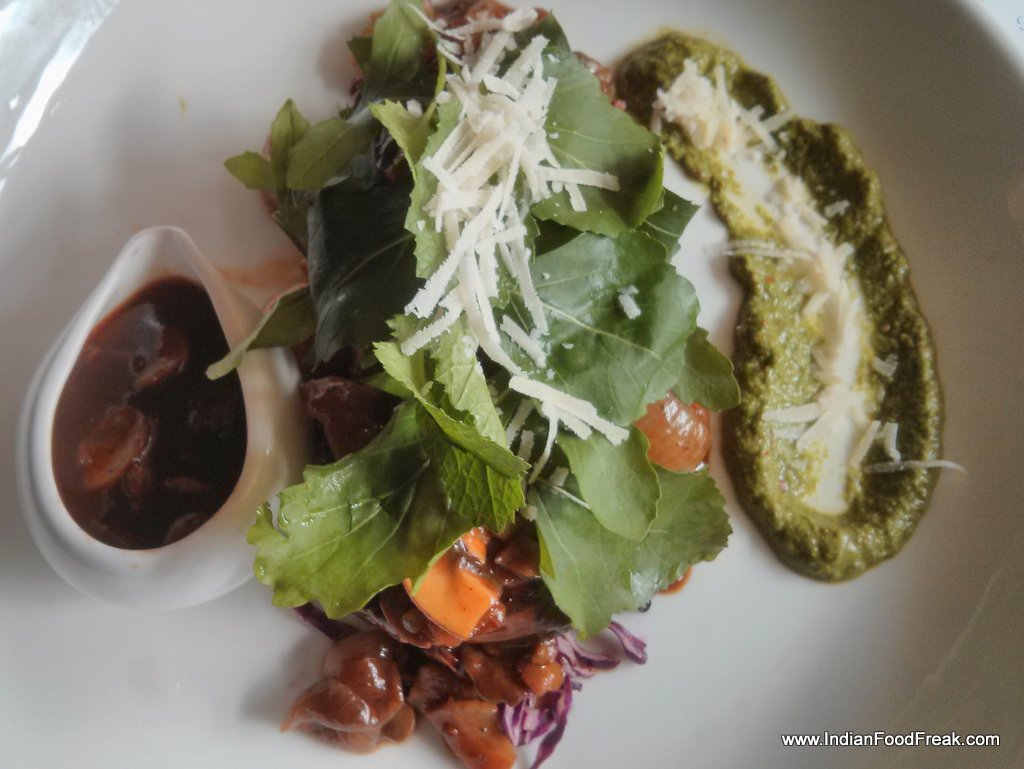he seared tenderloin with chimichuri (Rs.895) again impresses. It is a near perfect dish. Even though buff is being used, the quality is top notch, the cooking is a perfect medium rare, chimichuri is excitingly familiar to an Indian palate, and the bacon with jus is amazing. The dish is topped with…yes, you guessed it right, rocket leaves. This time around, I remove the rocket leaves and proceed to enjoy my perfectly cooked steak with its amazing sauce and liberally lather it with the jus.