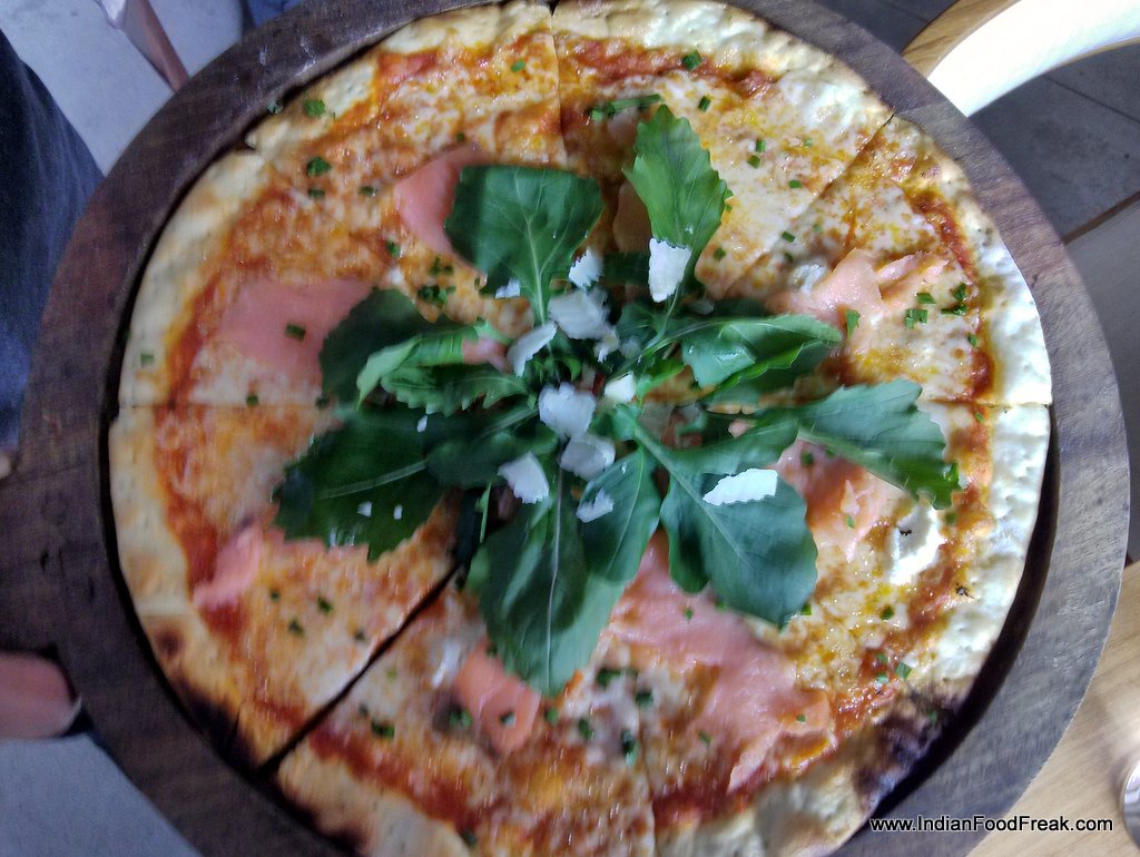I decide to start on a light note with the vegetarian cook house salad (Rs.545). The salad has iceberg lettuce, rocket leaves (there will be a lot of rocket leaves throughout the meal as I am soon to discover), goat cheese, snow peas, green apple, grape fruit, corn kernels and a fig dressing. The salad is well balanced with layers of taste, though the dressing can have a bit more zing to it. I am intrigued by the combination of smoked salmon and camembert cheese on a pizza, and so this is what I decide to try next. The combination works very well on the thin-crust smoked salmon, camembert, chives pizza (Rs.845), making it a very harmonious bite, with the smoky undertones of the salmon and the camembert coming together beautifully on a thin crisp crust, topped with rocket leaves.