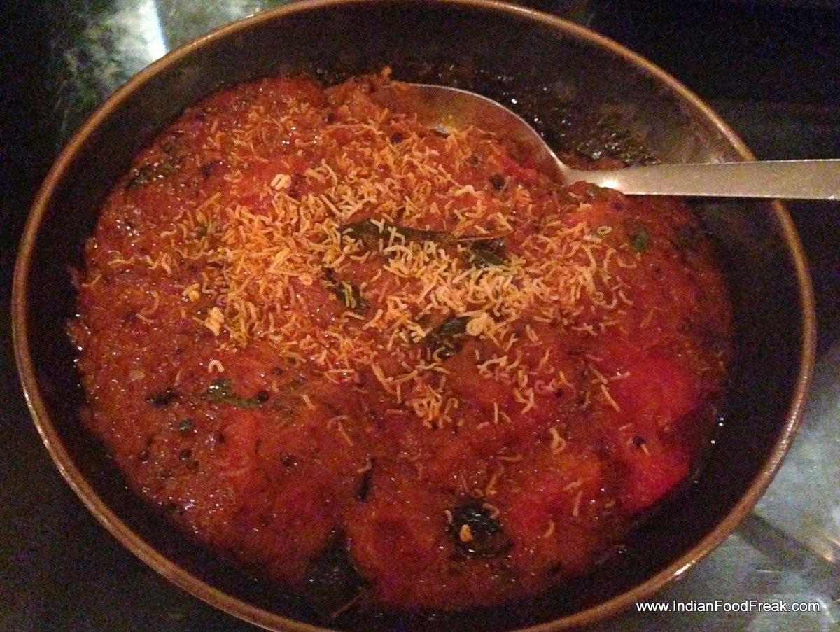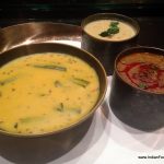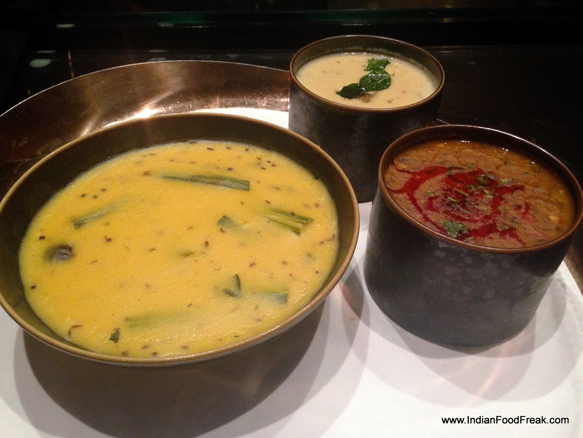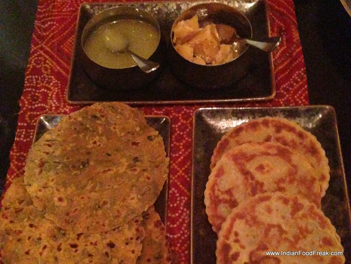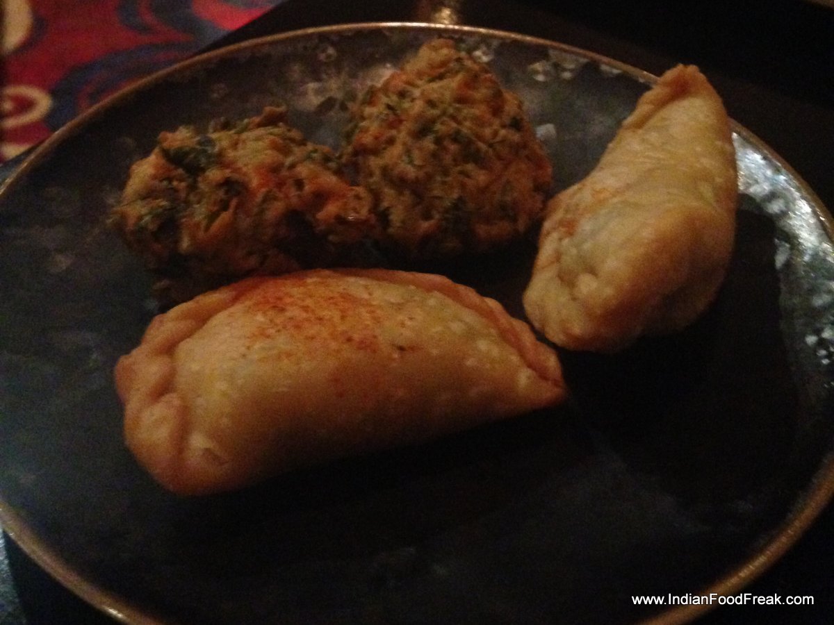 Born and bred in Gujarat on a regular diet of Gujarati food, I was looking forward to this. We started our dinner with Shikanjia concoction of lime, mint, kalanamak and Jeera Chhaas. While the Shikanji was refreshing the Chhaas was light foamy and just right to get our taste buds doing a wee bit of Garba! Then followed the appetisers of Methi Bhajia and Vatanana Ghugra. The methi bhajias were light and fluffy with just the right amount of fenugreek. The Ghugra however took the stage with its flaky exterior and taste-bursting filling! With the duet played by these appetisers along-with the array of chutneys such as Imli-jaggery Chutney, Mint Chutney and the Garlic-Red Chillies Chutney we were set to kick off the evening with a promise. We followed with a main course of Sev tamatar Nu Shaak, Saragrami nu besan accompanied with Bhakari and Thepala. The vegetables and breads got us going second and third rounds like doing Dandiyas in pairs!