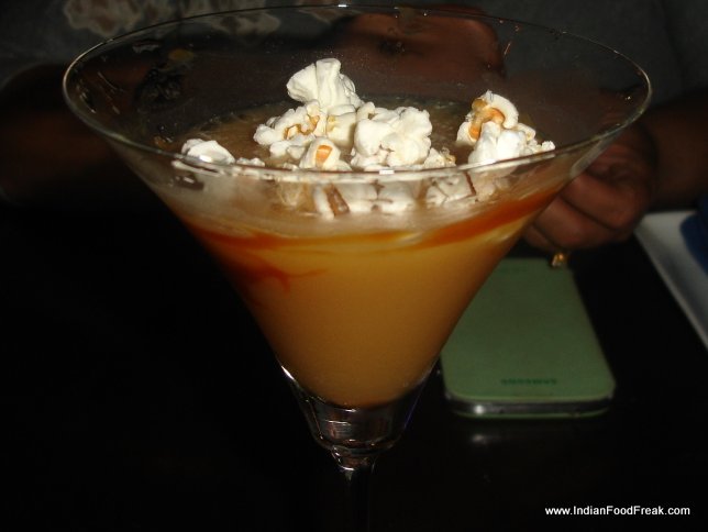 However, our disappointment in food was made up with the accompanying cocktails – A Caramel Popcorn Martini (Rs. 239) and a Green Lantern (Rs. 349). Both the drinks were unique and very delicious in their own rights. While the popcorn martini was sweet and salty in taste and the popcorn floating on the top had a unique flavour since the kernels had been infused with vodka for a few days before popping, the Green lantern was a merry mix of midori, white rum and pineapple with a dash of grenadine at the bottom, sweetness with a punch.