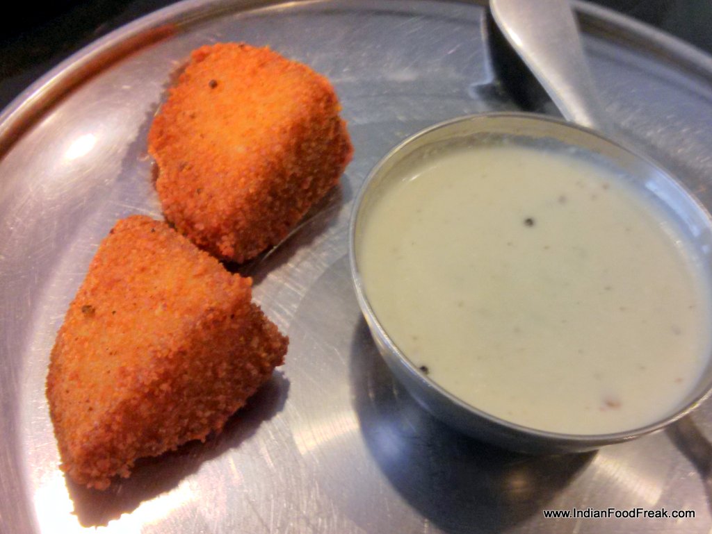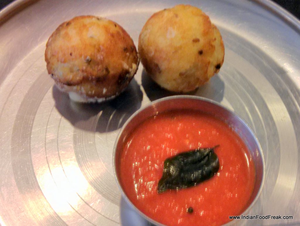 mirapakaya (green chilly) idli, and idli cooked with Chettinaad spices. All these variations are a first for me, and most enjoyable. Bright red looking fried cocktail idli (Rs 130) is the last of the idlis to be served. Crispy and piquant, it is truly a cocktail snack.