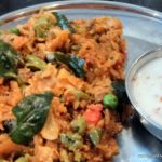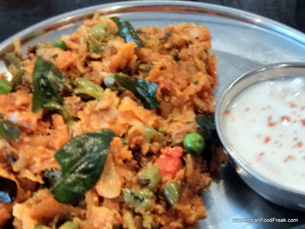 For the main course, Kunal prepares a taster thali for me with many of the dishes served at Kausstubh. Bisi Bele Bath (Rs 155) is a bit dry and