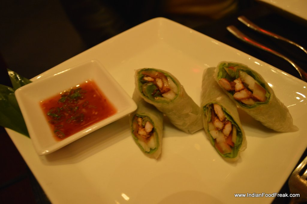 Xacuti masala grilled chicken rice paper roll. Though the description on the prawn dish mentioned marination in ginger, garlic, black pepper and lime juice, but due to the heavy panko crust, all I could feel was the crispy crunchy prawn. This was served along with a Thai sweet chilli sauce which added dimension to the dish and the combined taste was quite delectable. The Xacuti masala grilled chicken on the other hand, had used lettuce instead of the rice paper for their roll. Despite the chicken pieces being quite flavourful, the dish fell flat due to the lettuce being quite soggy.