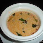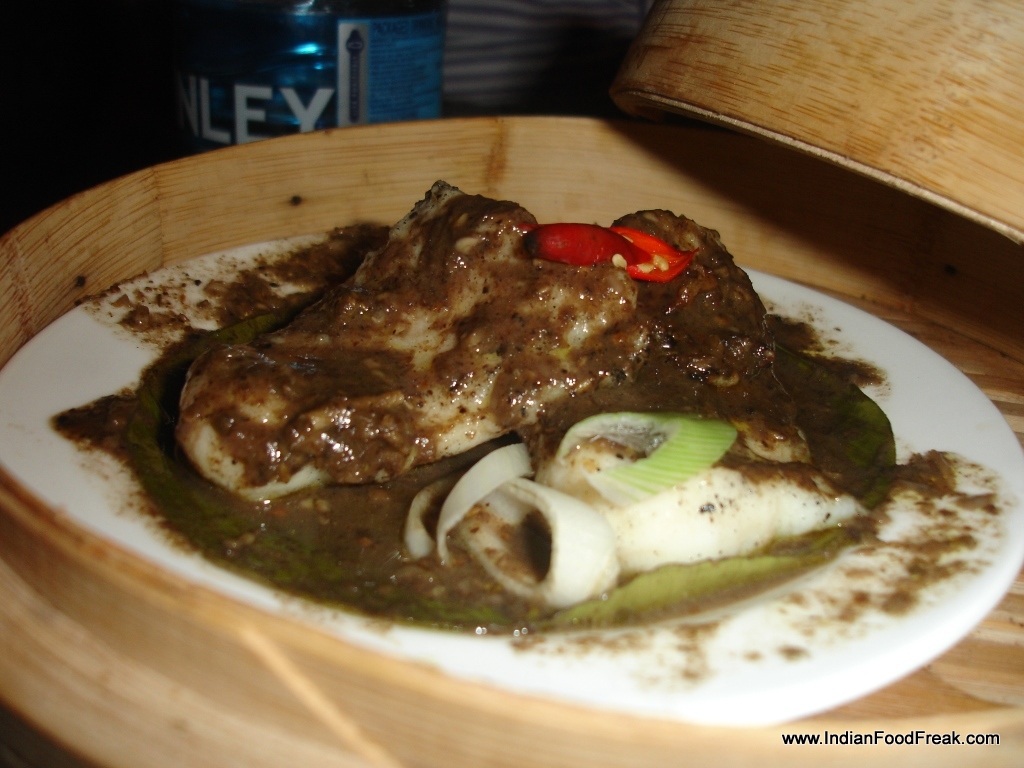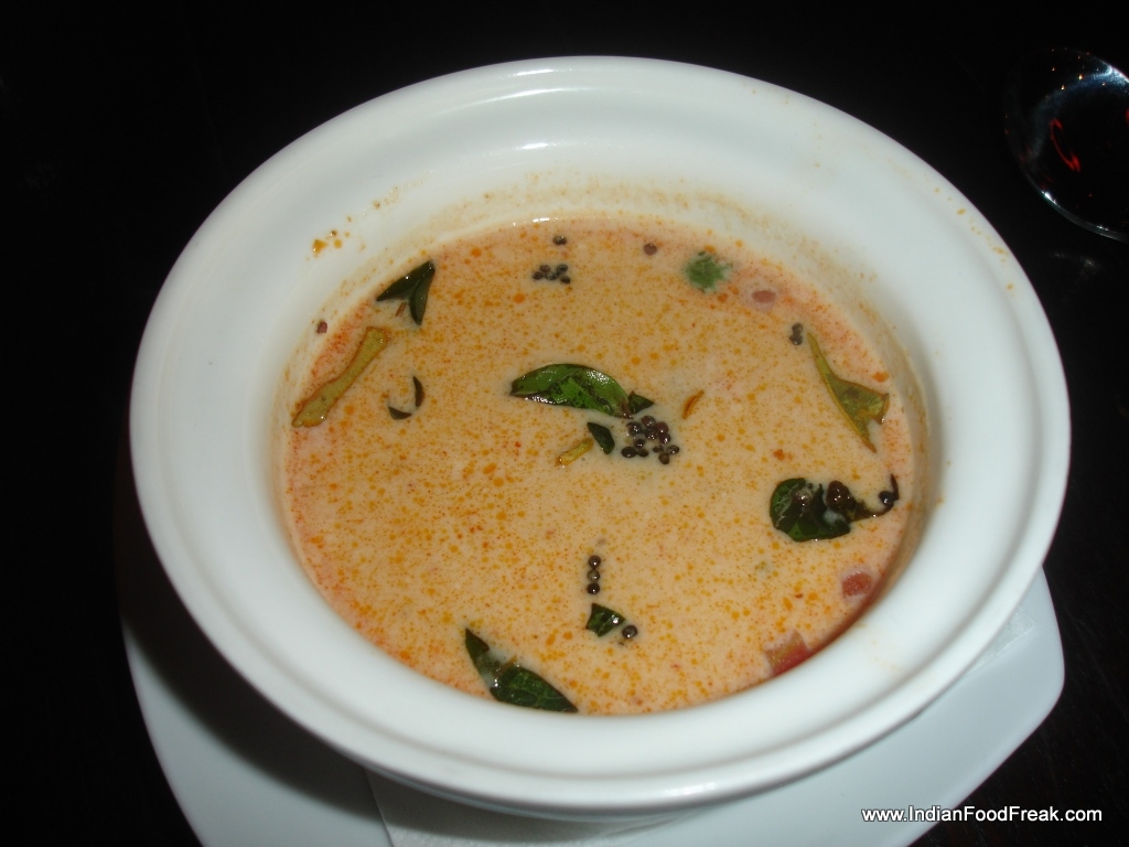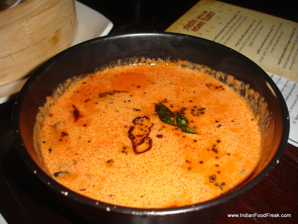 With the starters having made their presence felt, we moved on to the soup and were served the Coconut and lemon grass soup with rasam powder. It was a perfect Tom Kha soup with potent flavours of kafir lime and galangal with an interesting tempering of rasam powder and spices. Somehow the fusion of these two elements brought the dish to a totally different tangent and the table unanimously agreed upon it being the best dish to have been served so far.
