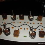 Finally the dessert which was not part of the chefs special menu, was brought to the table. Tiny petit portions of Chocolates, the most outstanding of which was a chocolate sushi with white and dark chocolate mousse rolled in a marbled chocolate case. This was most certainly the second best dish of the evening.