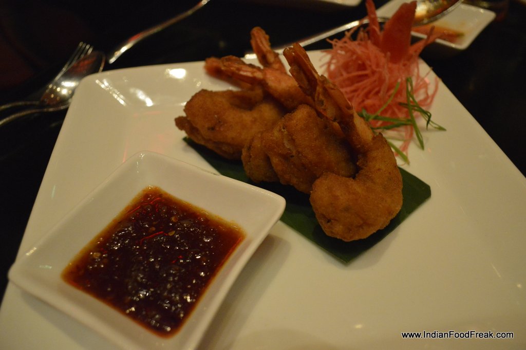 Prawn in panko rava styleWith the starters having made their presence felt, we moved on to the soup and were served the Coconut and lemon grass soup with rasam powder. It was a perfect Tom Kha soup with potent flavours of kafir lime and galangal with an interesting tempering of rasam powder and spices. Somehow the fusion of these two elements brought the dish to a totally different tangent and the table unanimously agreed upon it being the best dish to have been served so far.