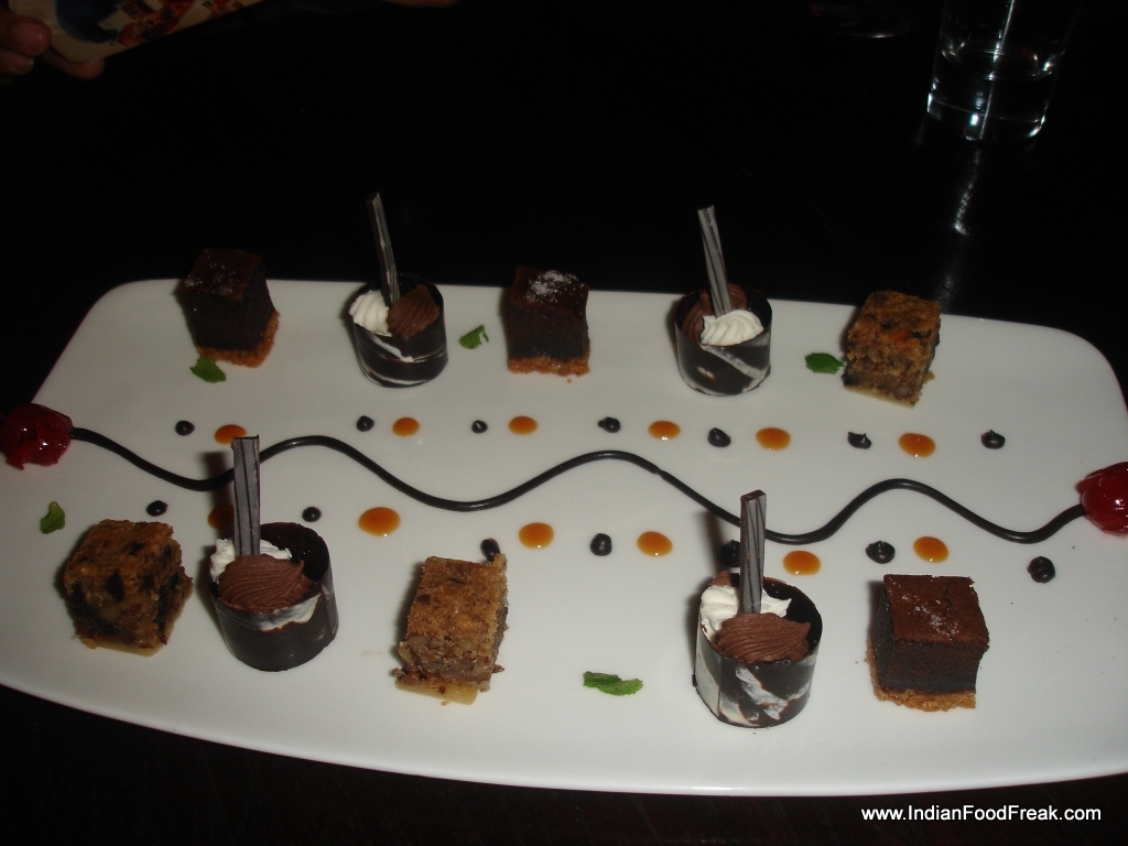 Dessert platter with chocolate sushi (1)Finally the dessert which was not part of the chefs special menu, was brought to the table. Tiny petit portions of Chocolates, the most outstanding of which was a chocolate sushi with white and dark chocolate mousse rolled in a marbled chocolate case. This was most certainly the second best dish of the evening.