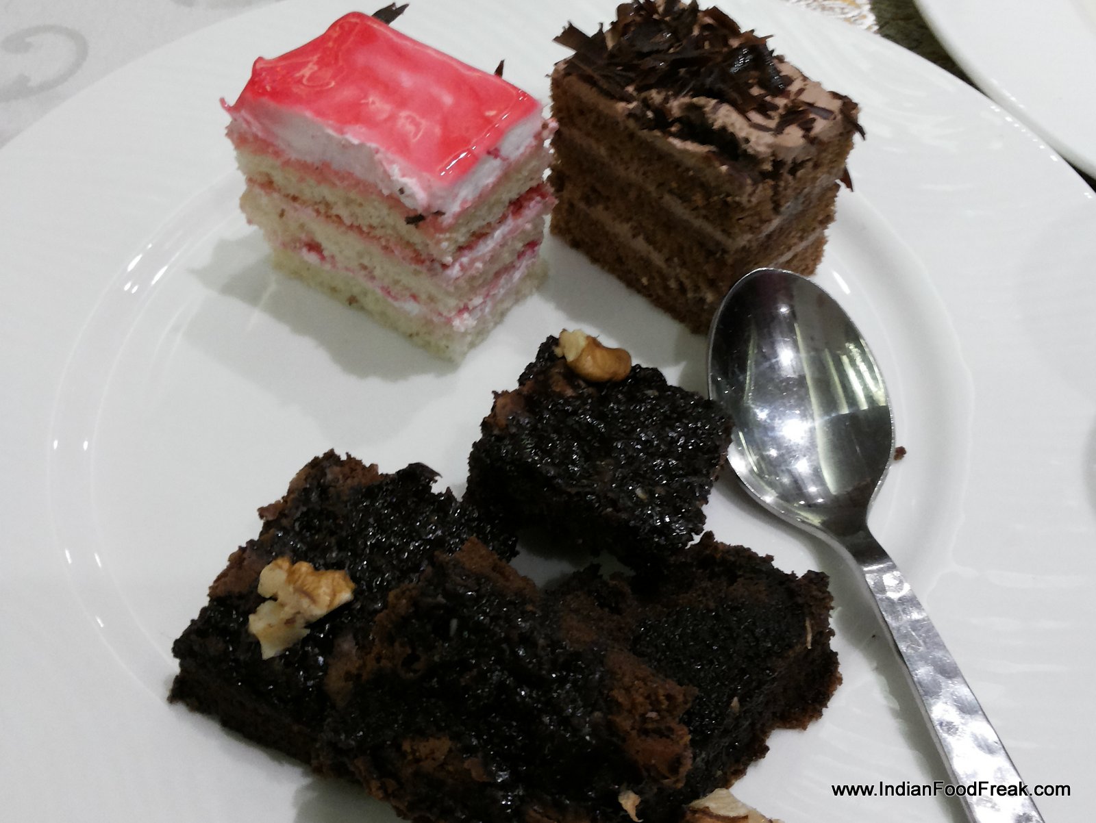 DessertsApart from these there are a variety of salads for the weight watchers like creamy cabbage, moong sprouts, cucumber, onion, tomato and carrot salad. I feel it’s a well balanced buffet, the dishes trying to cater to diversified tastes and preferences, though I strongly feel that the menu lacked that zing without any fish preparation specially for a fish lover like me. Chocolate walnut brownie, strawberry pastry, chocolate chips pastry, gulab jamun and my very own rajbhog of Bengal are the dessert items. Now that’s a sweet surprise for me because rarely do you find chhana(paneer) sweet in Amritsar. Our meal rounds off well with Twinings green tea which is the only thing I could desire at the moment to digest such a meal.