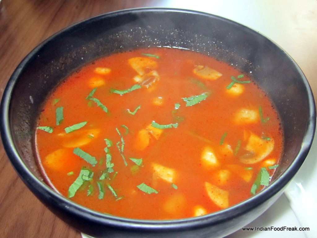 The tasting session starts with tom yum prawn soup (Rs