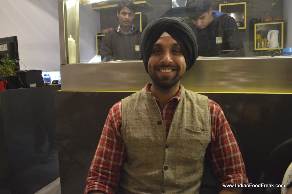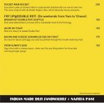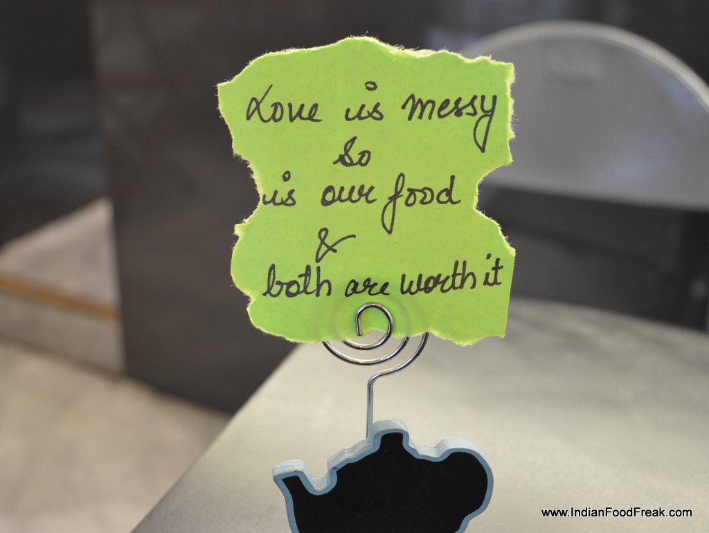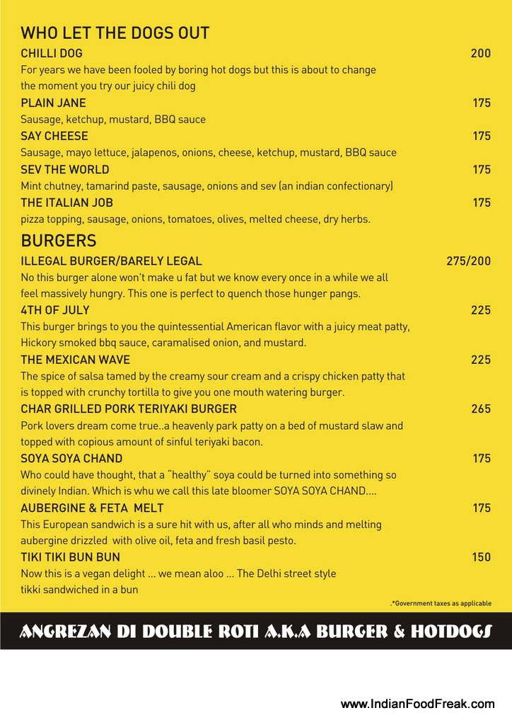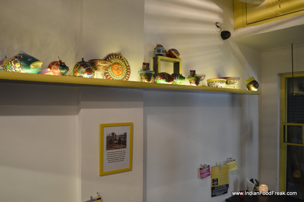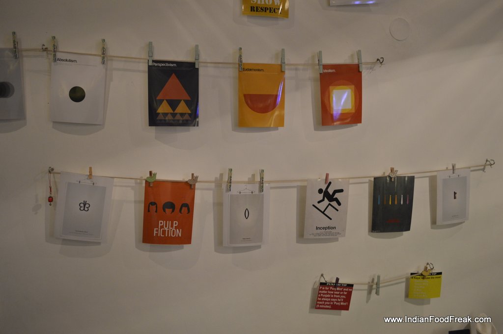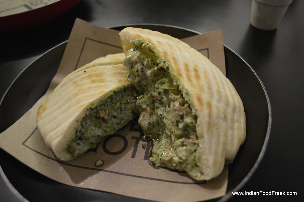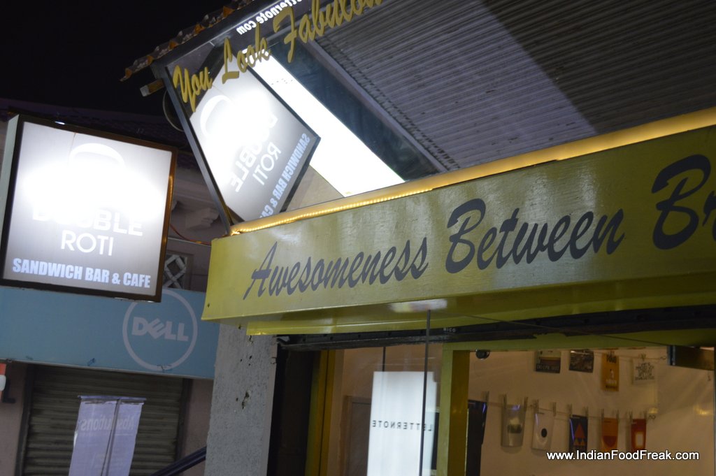 Double Roti sandwich bar and cafe serves much more. It has Pita breads, Tortilla, Burgers, Hot Dogs and as expected Sandwiches too both in white bread and brown bread option. The interiors are simple but funky. Interesting surd one-liner (Owner is a surd), yellow color in the background, plating in different types of girdle, tawa and jar gives this place a character.