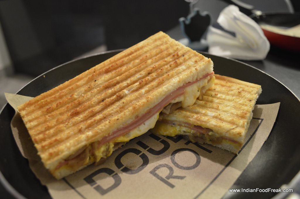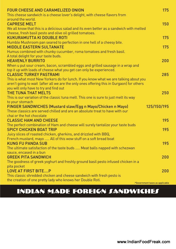 Alcohol: No | Credit Card: Yes | Meal for two: ₹500/-ddress: Double Roti Sandwich bar and cafe, SF-64, Galleria Market, Gurgaon | Phone: 0124-4239596