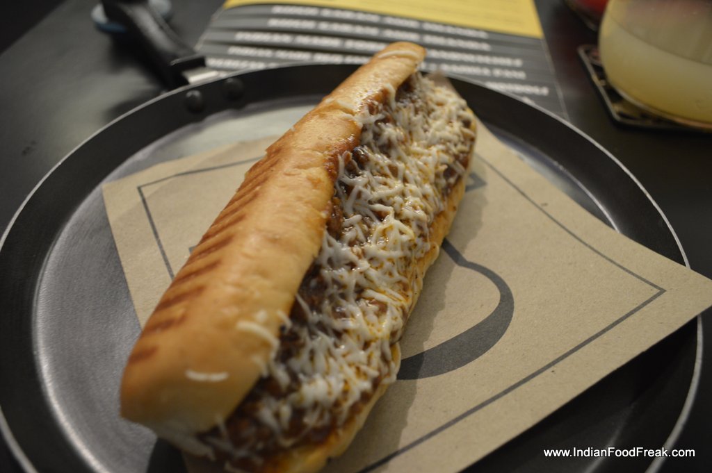 I am full by now and so is my friend. However greed takes over us. We ask for further recommendation from the smart owner Japtej Ahluwalia who left his F&B job at ITC Chennai to start this venture. He recommends Chilly Hotdog and suggest we try something from vegetarian spread too. Oops! The carnivore in us never once made us think there is much beyond the ‘meat-life’. And we ask for paneer bhurji toasty (125).