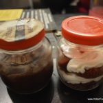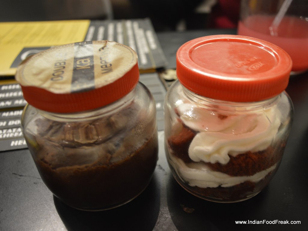 Desserts are served in take away jars and I try the red velvet cake (150). The cheese has become bit hard and the cake is not as moist; a sign of bad storage in a small outlet.