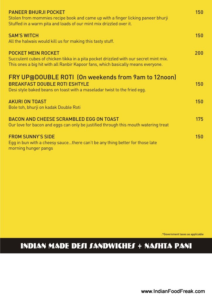 Alcohol: No | Credit Card: Yes | Meal for two: ₹500/-ddress: Double Roti Sandwich bar and cafe, SF-64, Galleria Market, Gurgaon | Phone: 0124-4239596
