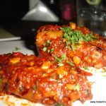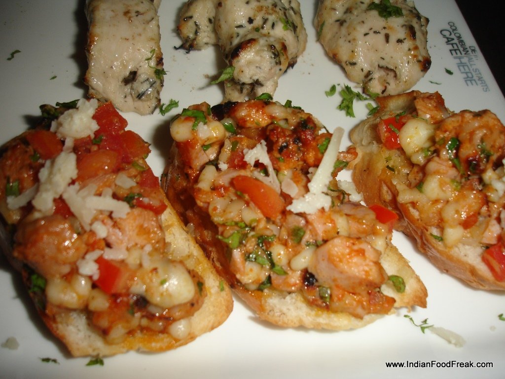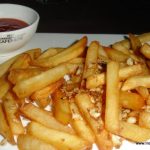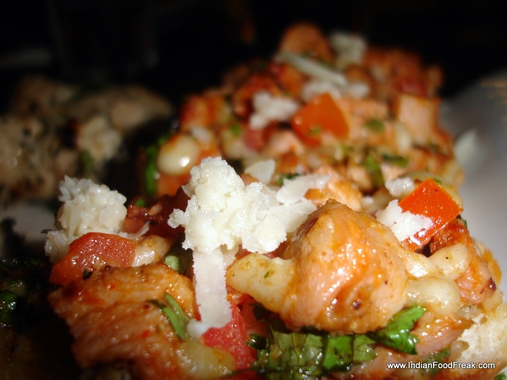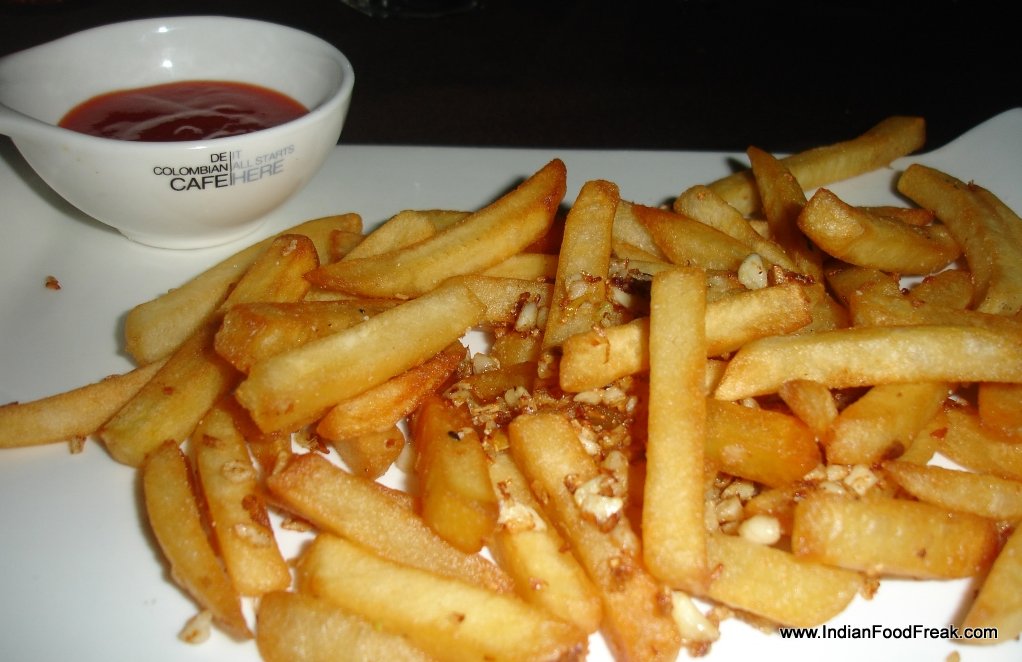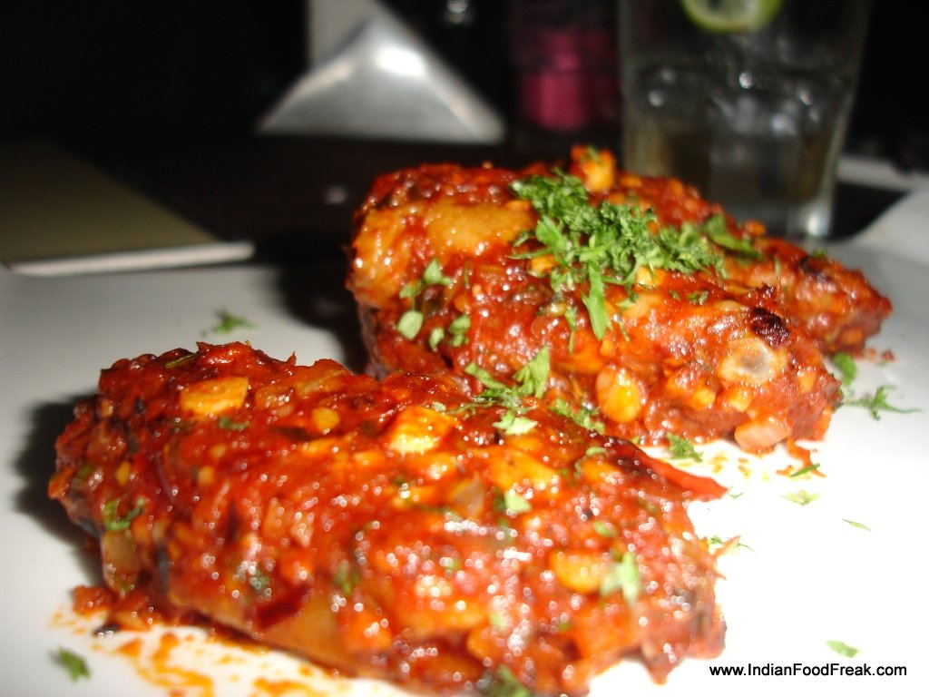 Moving on we tried the Corn Cheese Seekh Kebabs (Rs.200) and Stuffed Jalapeno Poppers (Rs.200). The kebabs were very silky and melt in the mouth – I have seldom eaten a vegetarian kebab with such delectable flavours, credits to the chef. The Jalapeno poppers unlike the popular bite sized versions, was a complete jalapeno with a crunchy coating and centre filled with cream cheese, making it an interesting bite and certainly a good snack to accompany the drinks. Another drink was soon ordered to tackle the heat caused by the poppers and I chose a Fresh Pomegranate Martini (Rs.450) and on the owner Nikhil’s insistence, their popular Long Island Ice Tea (Rs.500), both the drinks hit the right spot, though my heart went out more to the Long Island Ice tea as the Tequila and the vodka in the drink made for quite a heady cocktail. We tried a sampling portion of the Chicken Wings tossed in Chilli Sauce (Rs.250), Chicken Tikka Bruschetta (Rs.250) and a Rosemary and Thyme Murg Tikka (Rs.350), all the three dishes, though having the same common protein, were amazingly different in their taste and execution. I found the chicken wings a bit underdone, but the sauce coating with its intense garlic and chilli flavour, despite being too spicy to my taste, had that pull which makes one want to keep licking the sauce despite its heat. The chicken tikka bruschetta was a regular bruschetta with fresh tomatoes, olive oil, rosemary, cheese and chicken tikka bits topped on crispy bread pieces, the tikka did add to the dish but didn’t elevate it to any special levels. The Rosemary and thyme tikka was undoubtedly the star on the table. The chicken pieces were succulent and juicy and cooked to such perfection that they could be cut with a fork and the fork sliced through the chicken as if it was soft paneer. The tikka base was like the regular malaai tikka, but with the added herbaceousness of rosemary and thyme took the tikka to a wholly different level. We also tried the Garlic Tossed French Fries (Rs.250) which are crispy fries tossed in crispy garlic, interesting take on the regular French fries.