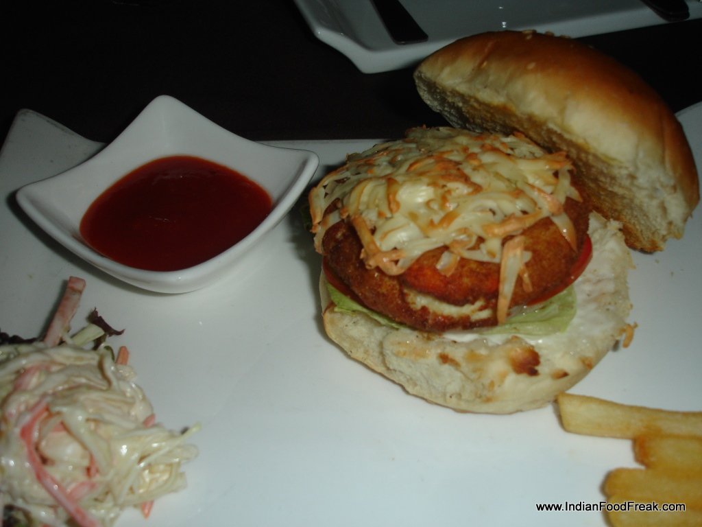 The only disappointments of the evening were the two pizzas – Pepper, Chilli and Mushroom Pizza (Rs.325) and Bolognese Pizza (Rs.350) perhaps because of a malfunctioning oven, both of them came out undercooked, the Bolognese a bit more than the vegetarian one and we decided not to insist on the same. Instead we went for their Veggie Burger (Rs.275); I must say I have never made a smarter decision in my life. Despite being a die-hard carnivore, I found myself fighting with my partner over the bigger share of the burger. The burger patty, unlike other patties was made of minced vegetables (Carrots, cauliflower, green peppers etc.) and made into a patty topped with the usual topping in a burger bun so soft that I could squeeze it all the way without it cracking or falling apart not any crumbs falling out of place. In short pure burger heaven!