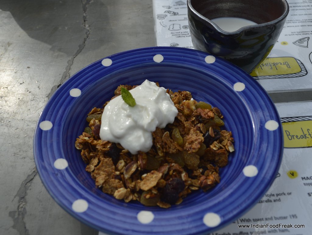 TCereal Sundaehis is late February and 2014 is a unique year when sun still doesn’t hurt and it’s still convenient with a jacket. The sun peeping through pyramid shaped glass building only makes atmosphere more comfortable, and I order a fresh water melon juice (180) and cereal sundae (165). Juice is fresh and served in a fancy martbaan (earthern vessel). I have never been fond of cereals but what is served at the Monkey Bar is spectacular. With house made granolas mixed with dried cranberry, pecan, wheat bran, honey, oats and topped with lemon yogurt it takes my heart. Bite after bite ensues, and a feeling that I am eating something healthy (atleast to start with).