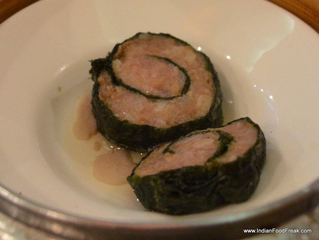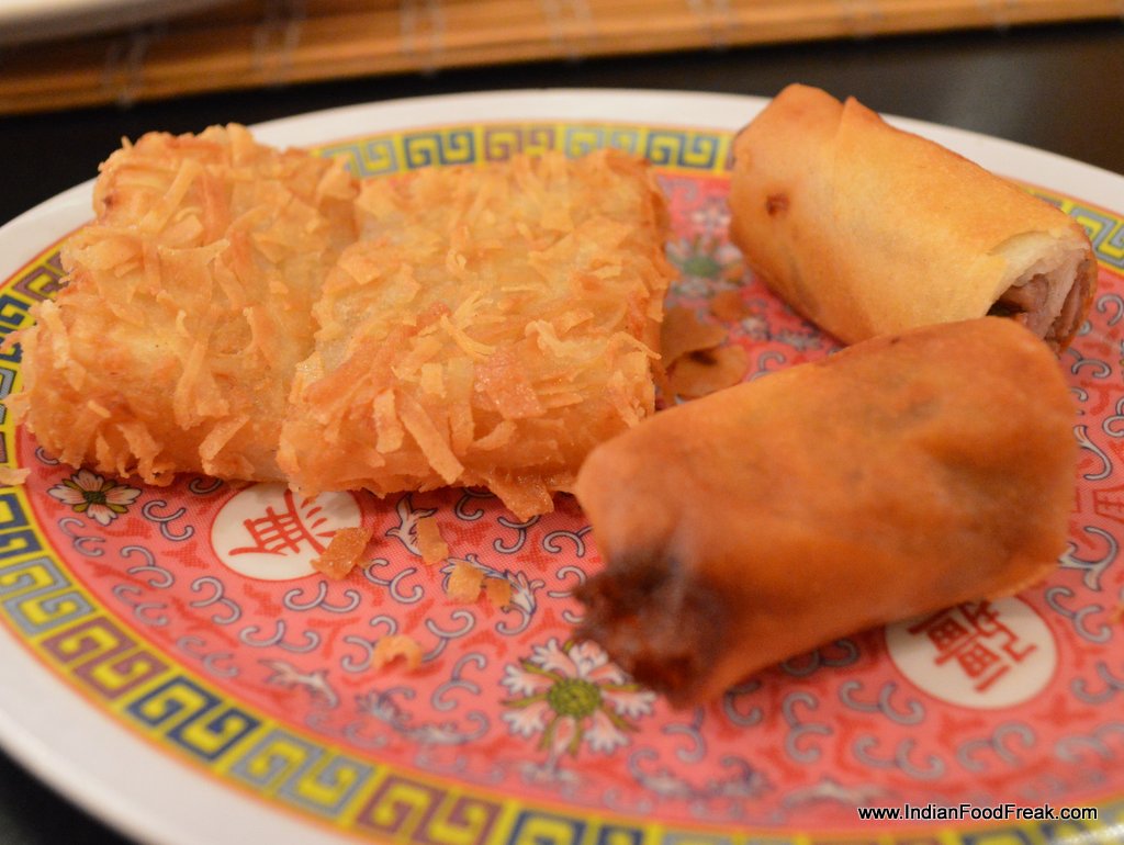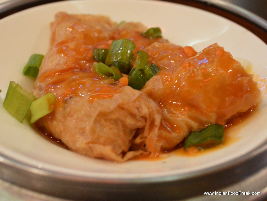 DSC_0122My worst fears turn real when the food starts arriving. The prawns are conspicuous by their absence in the prawn Hot and Sour soup (Rs 140). The Man Chow soup (Rs 140) that others are having on the table is somewhat better. The dim sums are competent but not memorable. Lotus stem sweet and spicy (Rs 275) has to be sent back because it is too tart to eat.