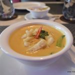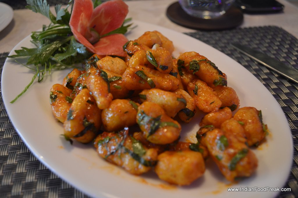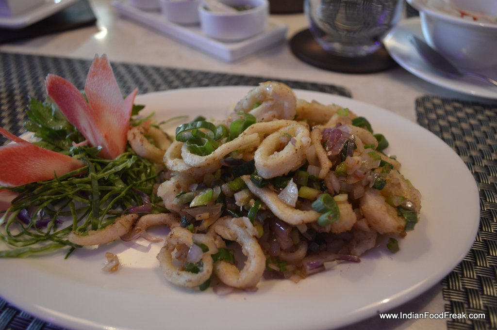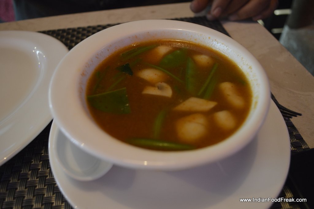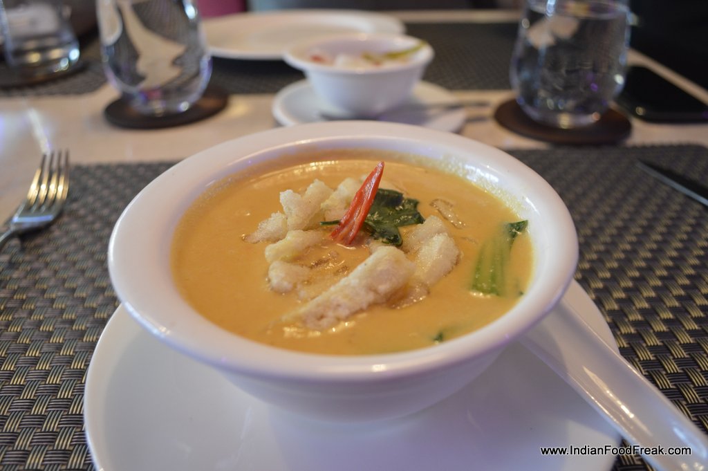 We settle in and study the menu which mostly has predictable dishes with some exciting options like soft shell crabs and other seafood, as well as some popular Asian dishes. Unfortunately soft shell crab and pomfret are not available so we adapt our order accordingly, starting with the soups which are the highlight of the meal. Tom yum shrimp soup (Rs 165) has the zing and the customary rustic touch of mushrooms, shrimps, and other greenery swimming in it. Laksa is a popular spicy noodle soup from the Peranakan culture. Laksa Lemak (Rs 475) also called Nyonya laksa is a type of laksa with rich coconut gravy. What we are served has a liberal helping of seafood is among the best we have had in India. With the warmth of good soups permeating our tummies we now look forward to the rest of the lunch.