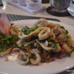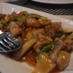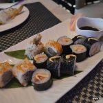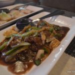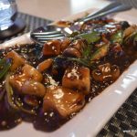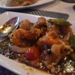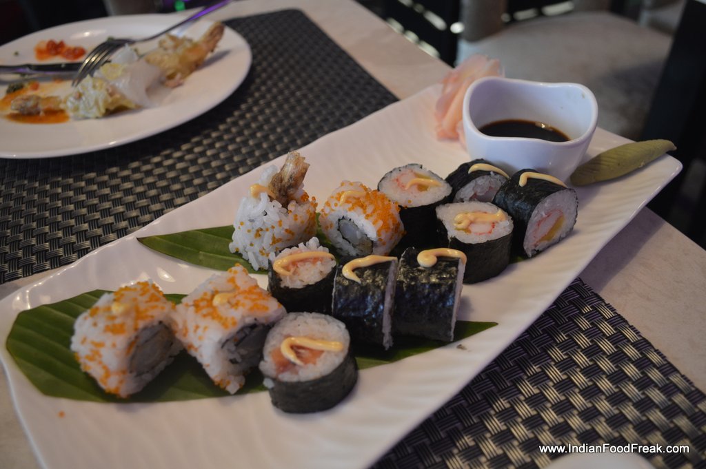 Starters start arriving on the table in quick succession. Wasabi Prawns (Rs 690) are too limp for my liking – something that often happens with frozen and thawed prawns – and lack the punch of the wasabi. Double cooked pork with chilly and black beans (Rs 415) is a good dish, but overdoes on the pork fat, and is a trifle over salted. Water chestnut with baby corn Thai chilly basil (Rs 260) is crisp and piquant making it an addictive bite. Salt and pepper calamari (Rs 390) is a competent dish. Assorted dim sums (Rs 325) are unremarkable. The chef is somewhat at sea with the assorted sushi (Rs 635) where the high proportion of rice to the meats devoids the sushi of its unique texture.
