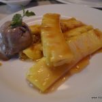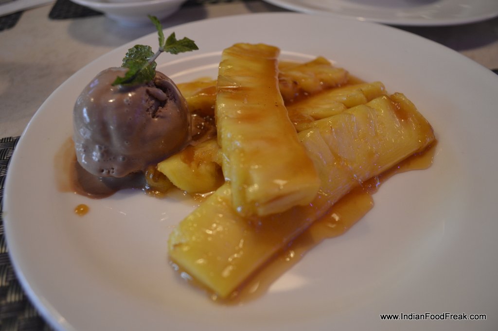We end the meal with an interesting caramelised pineapple with ice cream (Rs 200), and a lackluster mango pudding (Rs 200).
