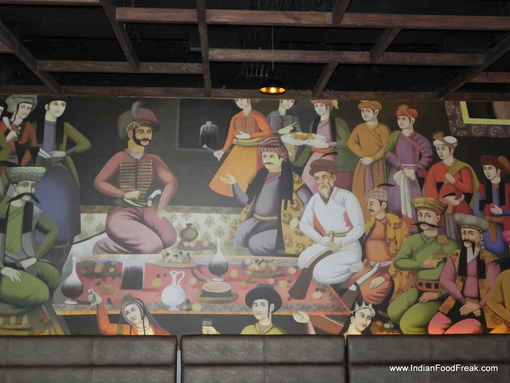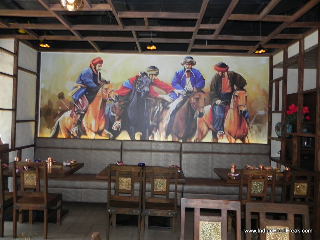 entranceAn Afghan warrior, on his black steed riding through the desert sands, rising up in front of the sun like a silhouette, the hoofs kicking up a storm, a game of Buzkashi underway, dark intense eyes above the mask! Oh Yes! The film Khudagawah was my favourite fantasy like that of many others in 1992. Khiva, a month old venture heralding BJN Hospitality’s foray in Mumbai took me to that amazing reverie back again. The large murals of warriors on horseback, chandeliers, wooden tables with tile inlays, subdued relaxed atmosphere, exposed bricks and the aroma of kebabs and tandoor…. Sent my heart skipping a beat! The romantic and the foodie in me both jostled to gain attention. That anticipation coupled with the memory of soul-satiating meals at Samarkand in Bangalore, as we learnt that Chef Sujit Kumnar Dey was the one who had designed the menu and cooked there as well. My foodie heart was singing a happy song already.