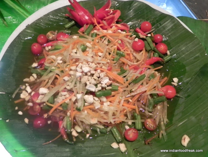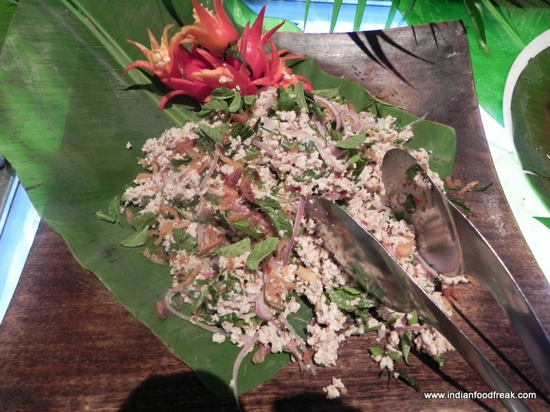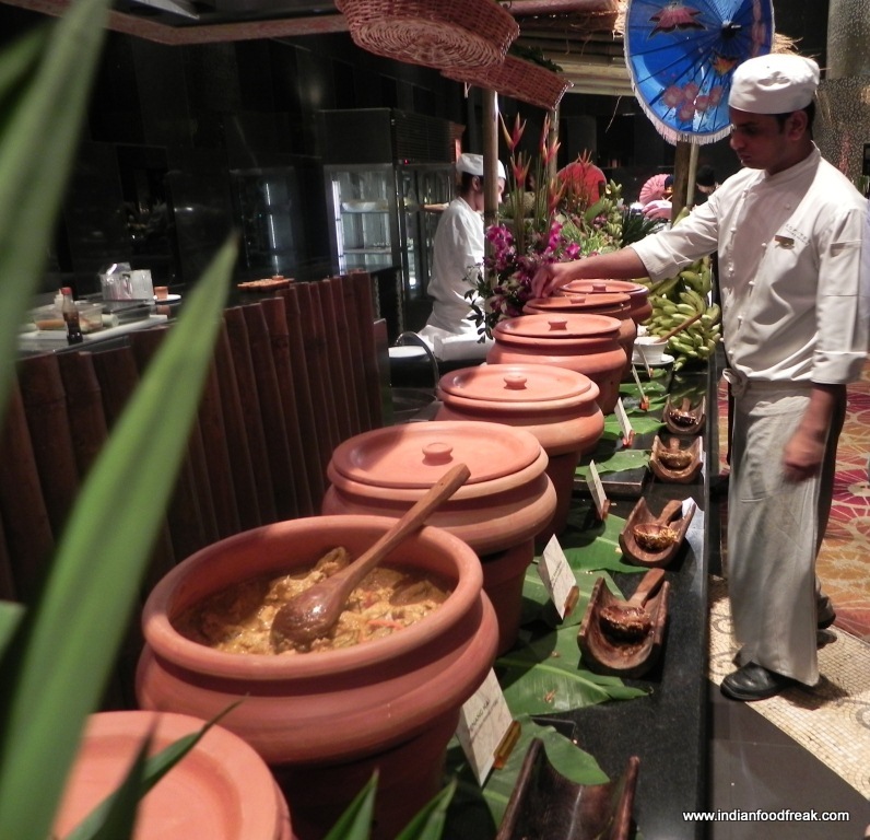 We then moved to the Pondicherry café for the Thai buffet. Apart from the usual continental salad and cold cuts there were specific Thai based salads such as Larp Kai,a minced chicken salad with mint chilli and rice powder; beautifully fresh and spicy and Som Tam, raw papaya salad with chilli garlic and tomato; ticked all the right boxes of tangy, sweet, spicy and delicious. The raw banana and beetroot salad was interestingly fresh and unusual.