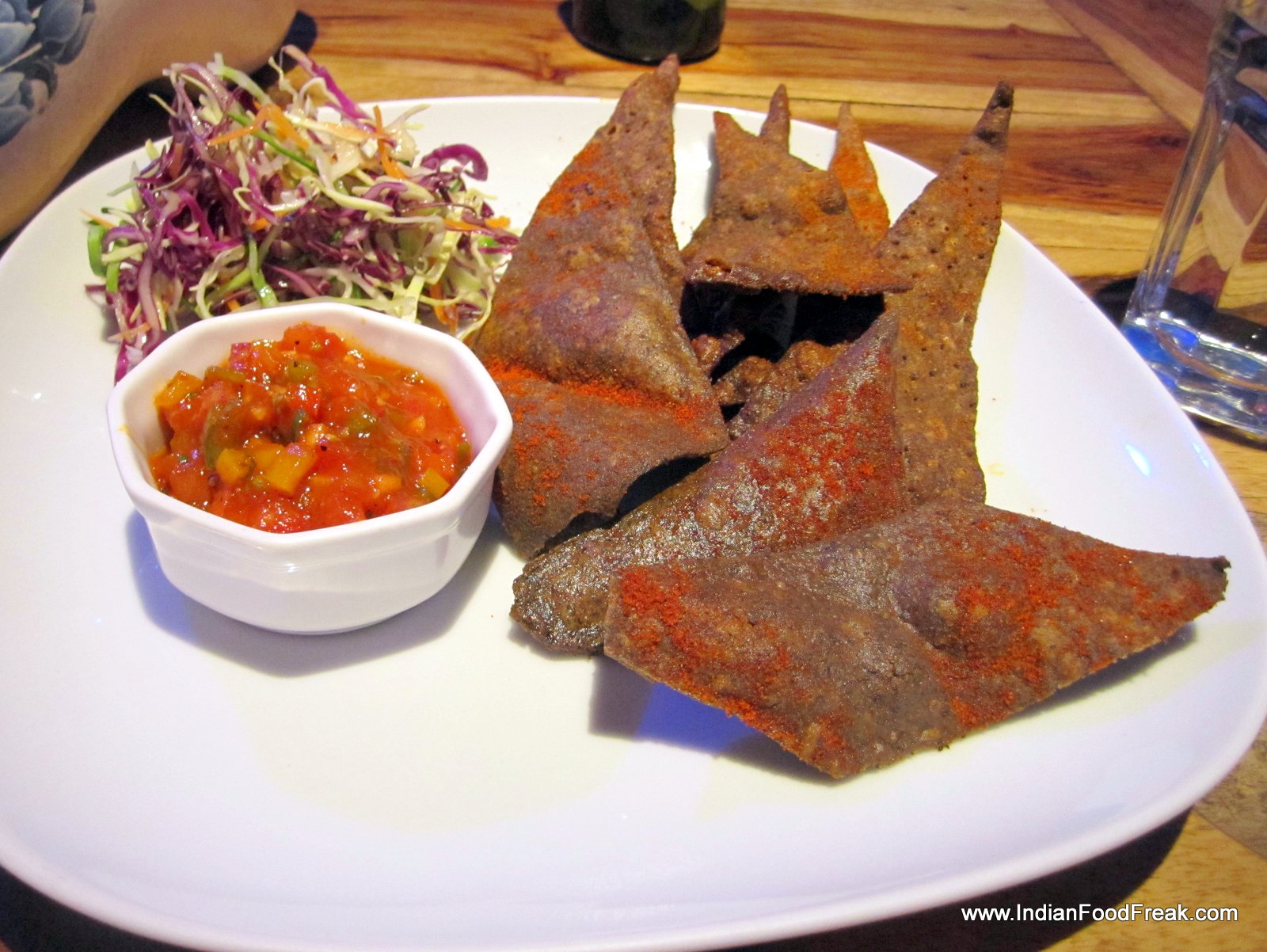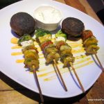 I start the tasting with buckwheat (called kutu ka aata in Hindi) nachos with paprika dust and tomato salsa (Rs 450). These are good nachos combined with a spicy salsa. Spinach and potato roundels with crispy buckwheat florets (Rs 450) is nothing but an aloo palak tikki crowned by a papad like fried kutu. While the dish is edible, it is not much more. Grilled skewers with paprika and rock salt emulsion with yoghurt dip (Rs 450) come next. Here we have paneer cubes, lots of different kinds of bell peppers and zucchini skewered on wooden sticks and grilled. The paneer does not taste fresh, and the taste of the skewered vegetables lacks any depth or twist.