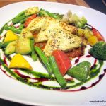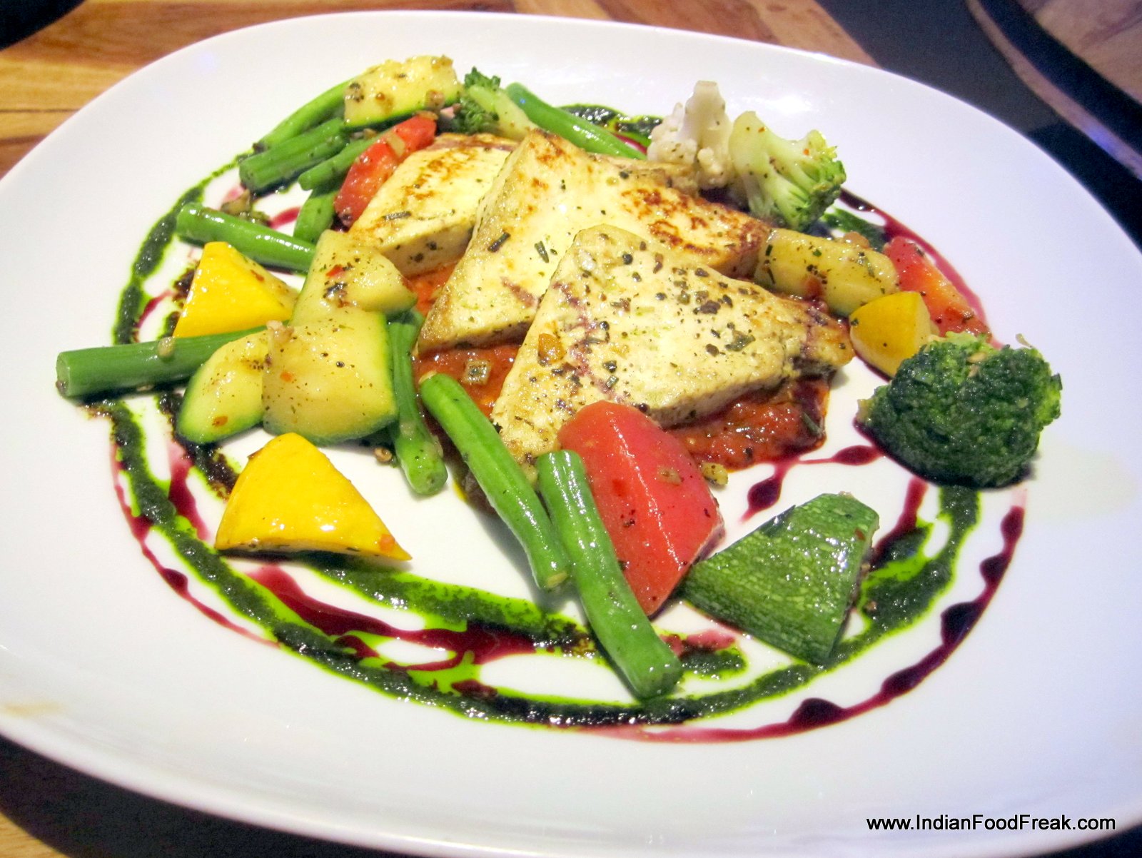 I dig into the buckwheat pizza with grated paneer topping (Rs 450) with some trepidation, because its look reminds me of the cardboard pizzas I used to make for pretend tea parties as a child. The taste is somewhat better (maybe because I never tasted the cardboard pizzas), but since the base has no chewiness and paneer does not provide enough cheesiness, the pizza is very dry to taste. Grilled cottage cheese steak with tomato mint coriander sauce and seasonal vegetables (Rs 550) has grilled slices of paneer (here it is relatively fresher) placed on a tomato based sauce and accompanied with seasonal veggies. The taste and the texture of this dish both are quite bland and boring.