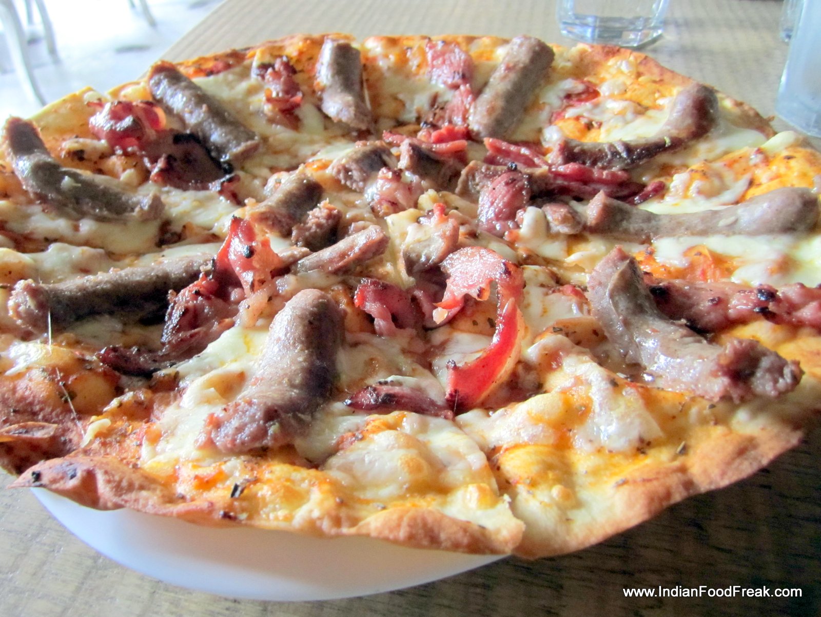 For the main course we have the popular Antler’s nest lamb burger with Worcester sauce (Rs 480). The burger would have reached perfection had it not been for the bun that goes soggy and disintegrates in our hands. The lamb patty is juicy and well seasoned and is polished off without the bun. Next comes the Hunter’s barn pork sausage pizza with crispy bacon (Rs 465) which looks like a pork lover’s delight but is a bit of a disappointment as the crust is thin and crisp but the sausage has a lingering processed taste on the tongue.