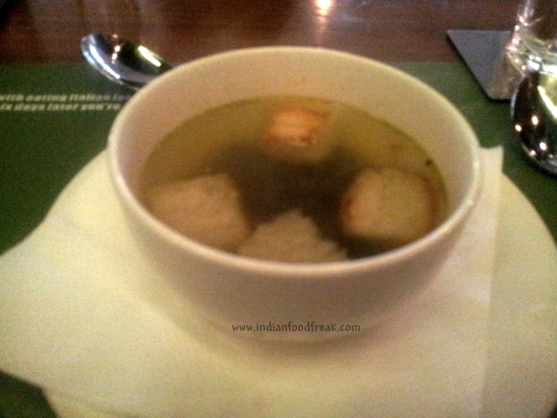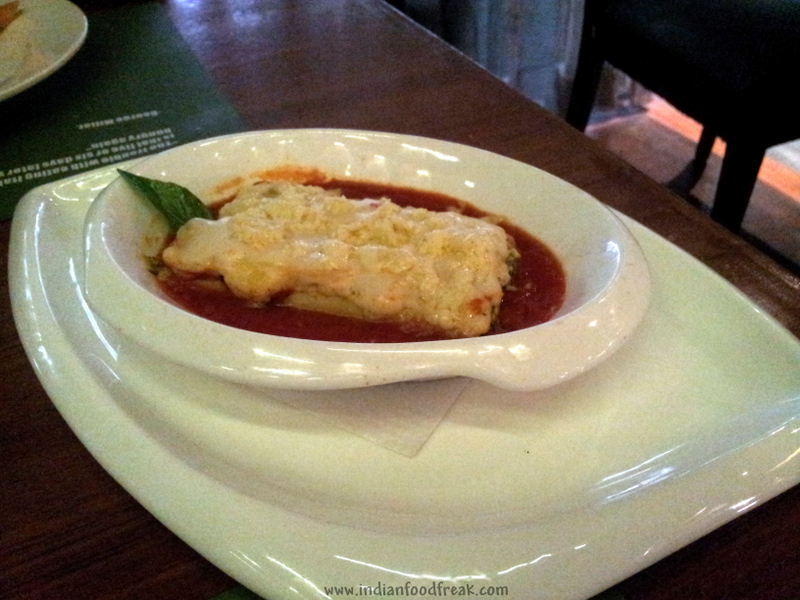 The second Antipasti was Patate Taormina. Potato slices tossed in cream cheese flavored with spring onions, garlic and black pepper, served with warm bread. I’m not very fond of cold starters but if I had to have this again, I would. Loved the creamy texture of the dish!